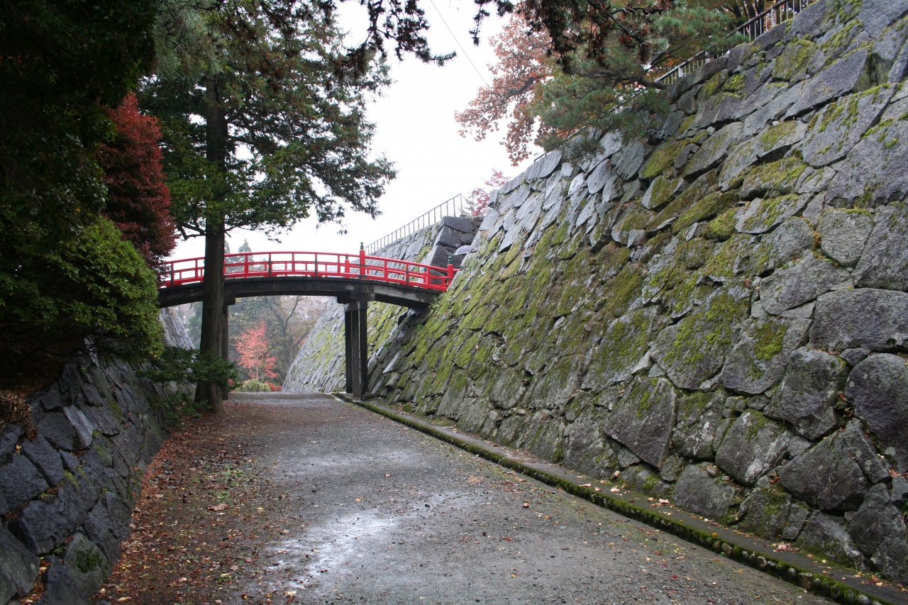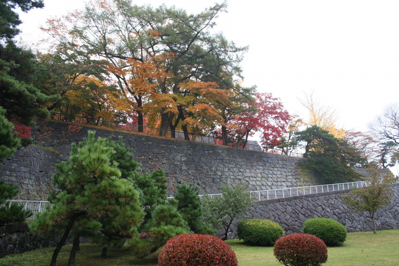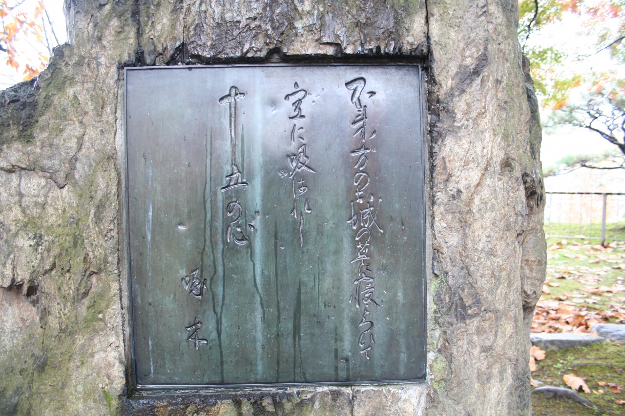 大通りをブラブラ歩いて行くと、突然、巨大な石積みが現れました。紅葉と雨に濡れた石積みが美しく、写真撮影大会が行われていました。1時間ほど散策しました。啄木ファンとしては、歌碑が見逃せません。石割桜を見ながら啄木新婚の家まで徒歩10分、さらに盛岡駅まで徒歩10分でした。