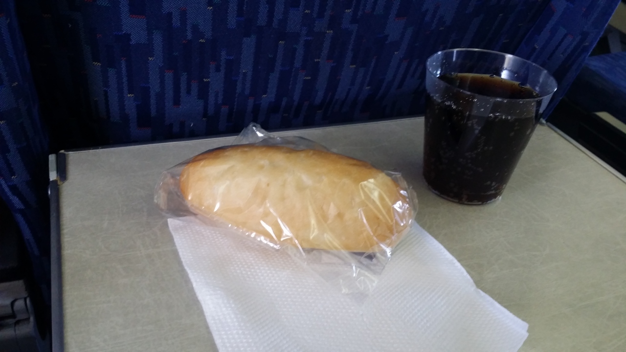 イリューシンのプロペラ機です。待合室で冷水飲み放題。離陸前に水が1杯と、到着前にパンとコーラが供されました。揺れもせず順調に飛行しました。