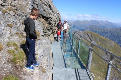 ゴンドラで上がって行くと、正面の岩壁にスカイウォークが見えます。屋外レストランの中を通り抜けて早速行って見ました。