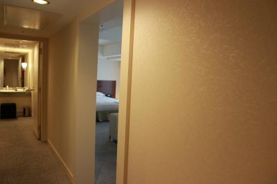 エレベーターから部屋まで廊下はオープンエアで、雨が吹っかけ床が濡れていました。