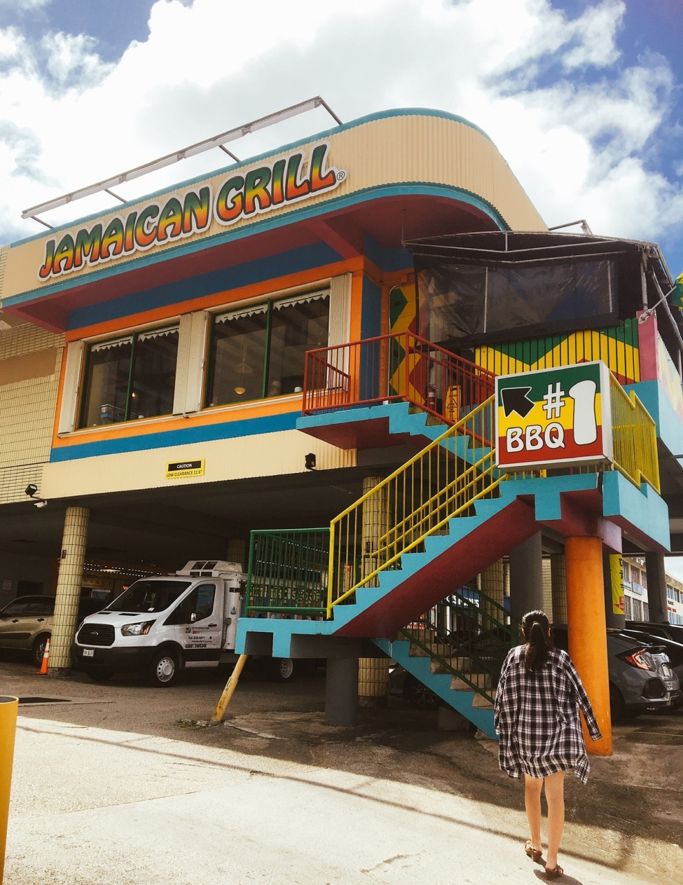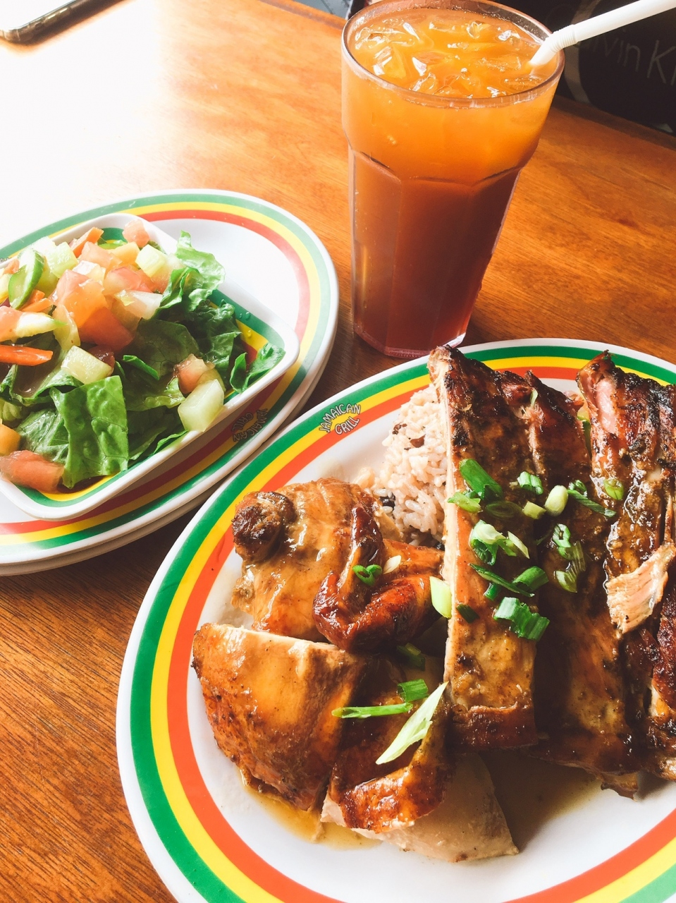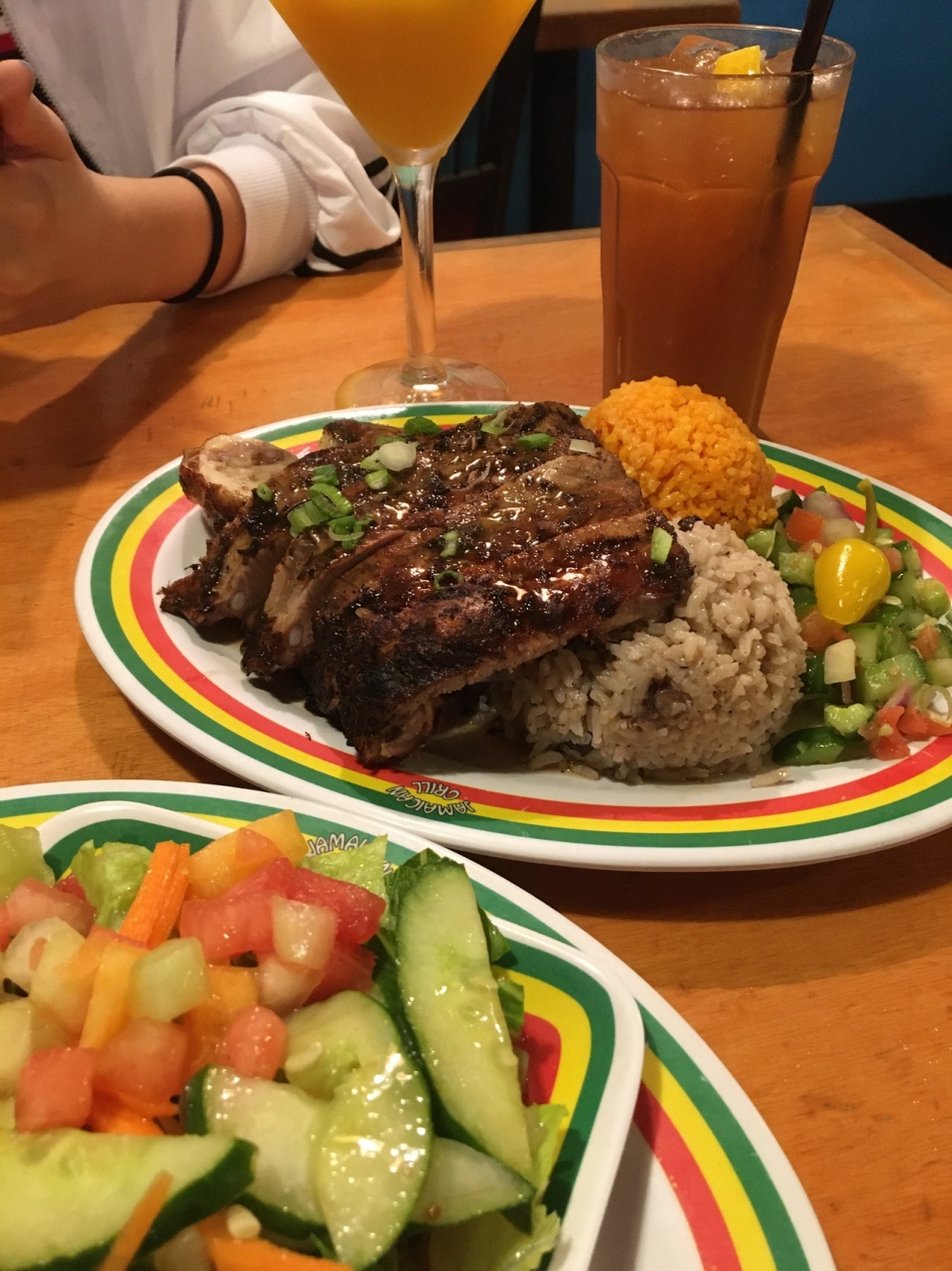 ジャークチキンとリブのコンボを注文しました。サラダかスープが付いてきます。サラダは小さい角切りのスイカがアクセントになって美味しい。リブは私は少しスパイシーと感じる程度でしたが、高3の娘は唇がピリピリすると騒いでました。ご飯が2スクープあるので、完食したかったら2人(女性)でシェアがいいと思います。タビートのサイトでマンゴーティーのクーポンがあります。