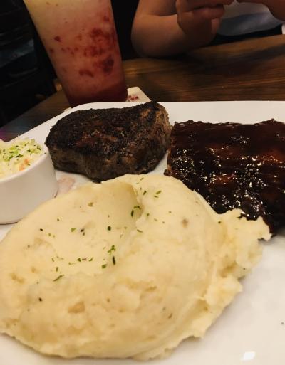 サーロインとリブのコンボを注文。リブは酸味があって美味しかったです。黒パンとサラダも付いてくるので満腹です。マッシュポテトもデカ過ぎー!