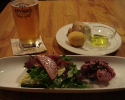 沖縄旅の一日目、宿泊先からも近かったので偶然立寄りました。まずはオリオン・ビールでパスタとサラダを頂きましたが、前菜のサラダ&酵母パンはメイン料理の影が薄くなるくらい美味しかったです。