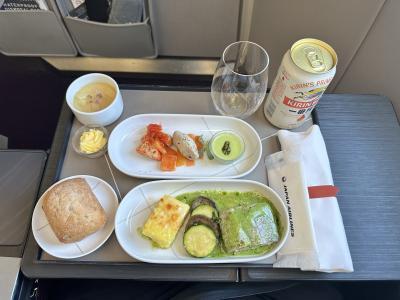 那覇空港から伊丹空港への移動、夕食時ということもあり機内食がついているファーストクラスにアップグレードして利用します。離陸してまもなくすると機内食の準備が始まり気分が高まります。