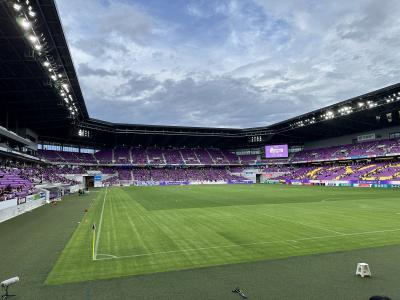 アウェイ席は芝生といす席の2層構造、珍しい。高いところから見下ろすことができ見やすいですが少し遠いのが残念。立山連峰が席から見えるのは圧巻でした。- 旅行時期