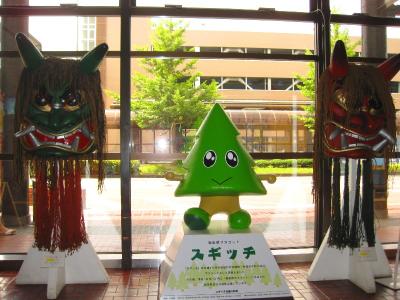 秋田空港着!秋田のゆるきゃら(?)スギッチとなまはげ(頭だけ、コワイ)...