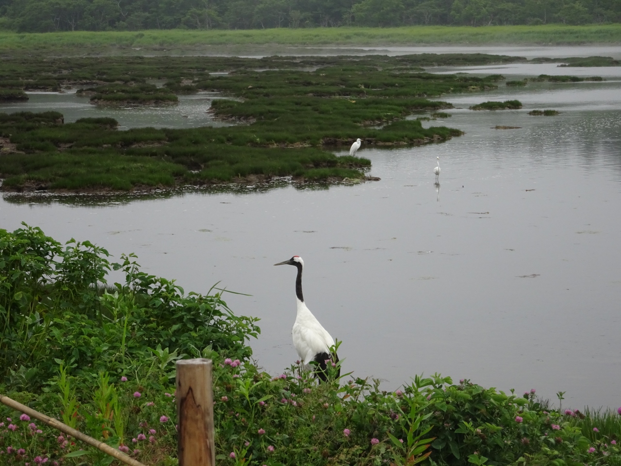湖の浅瀬に目を凝らすと何か鳥のような動物が2羽(∵)? かすかに丹頂と認識できる程度でしたが、私どもの行動を見ていた他の観光客が「マジか!」と叫び、同じように鑑賞していました。