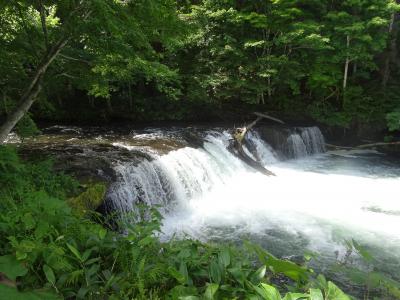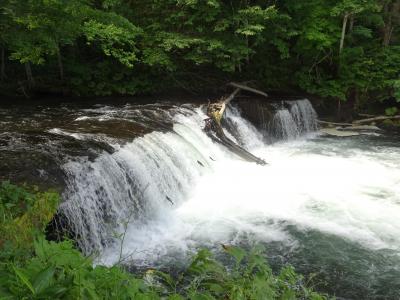 神の子池から道道1115号線に戻り北上、さくらの滝の標識を見つけ車を走らせます。途中までは舗装されているものの、砂利道となり、ヒグマが出てこないか心配しながら辿り着くと、駐車場には何台かの車が停車しており、一安心。