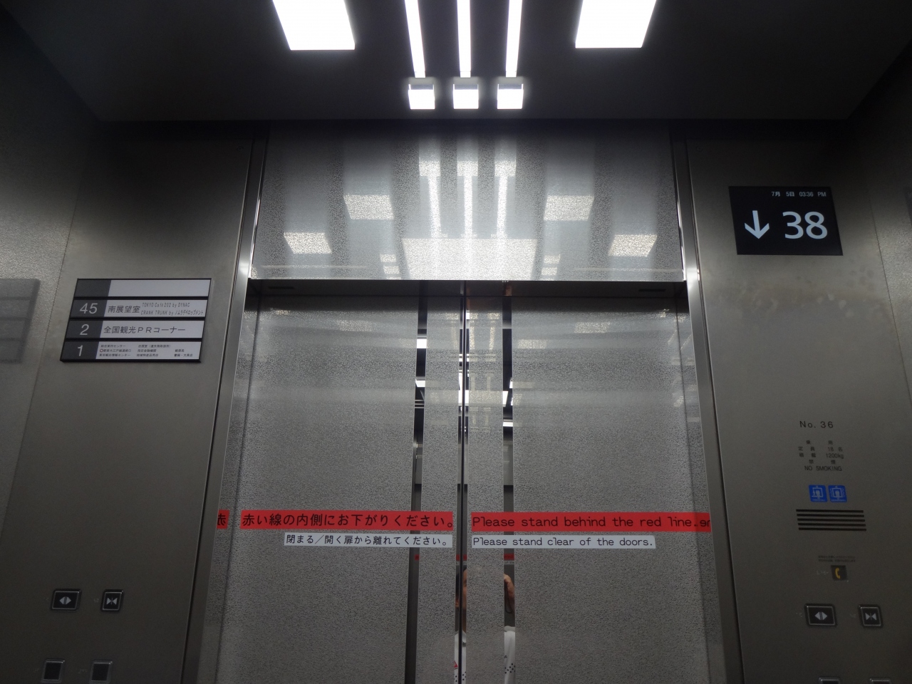東京都庁に到着すると、展望室への受付があります。前回は北展望室へ行ったので、今回は南展望室です。受付では持ち物検査があり、不審物をチェックを受けます。それが済むとエレベータに案内されます。