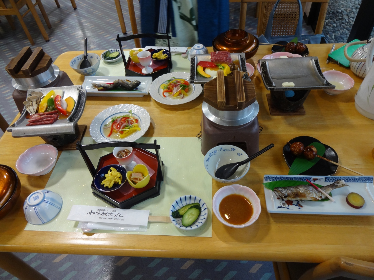 夕食は木曽駒御膳+木曽牛ステーキを予約しておいたのですが、到着すると御膳にも肉料理がついていますので、どうしますかと聞いてくれる心遣いもありました。