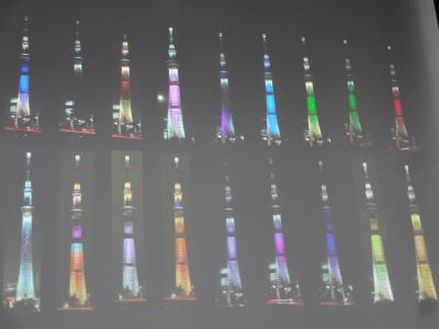 スカイツリーでの説明では、日照権の問題で泡を縦にできず、横にしたとのことです。そのおかげで○○○のように見えるのか・・・