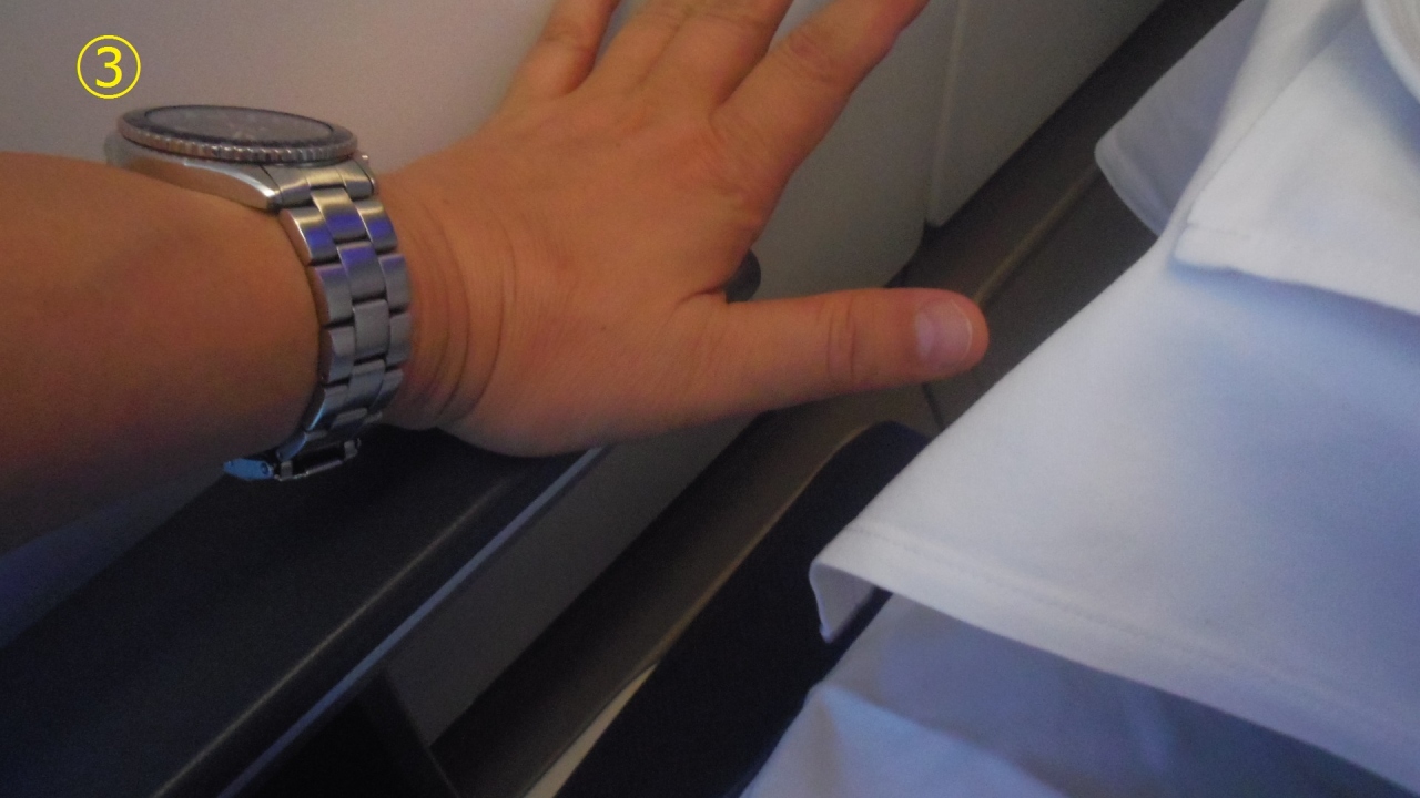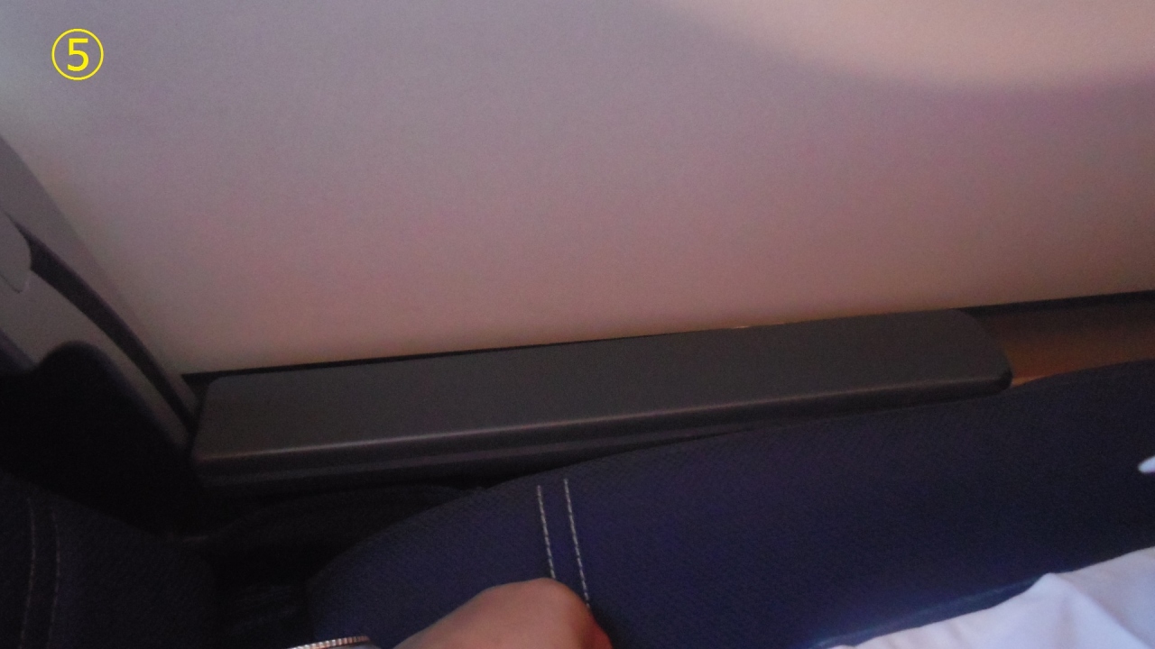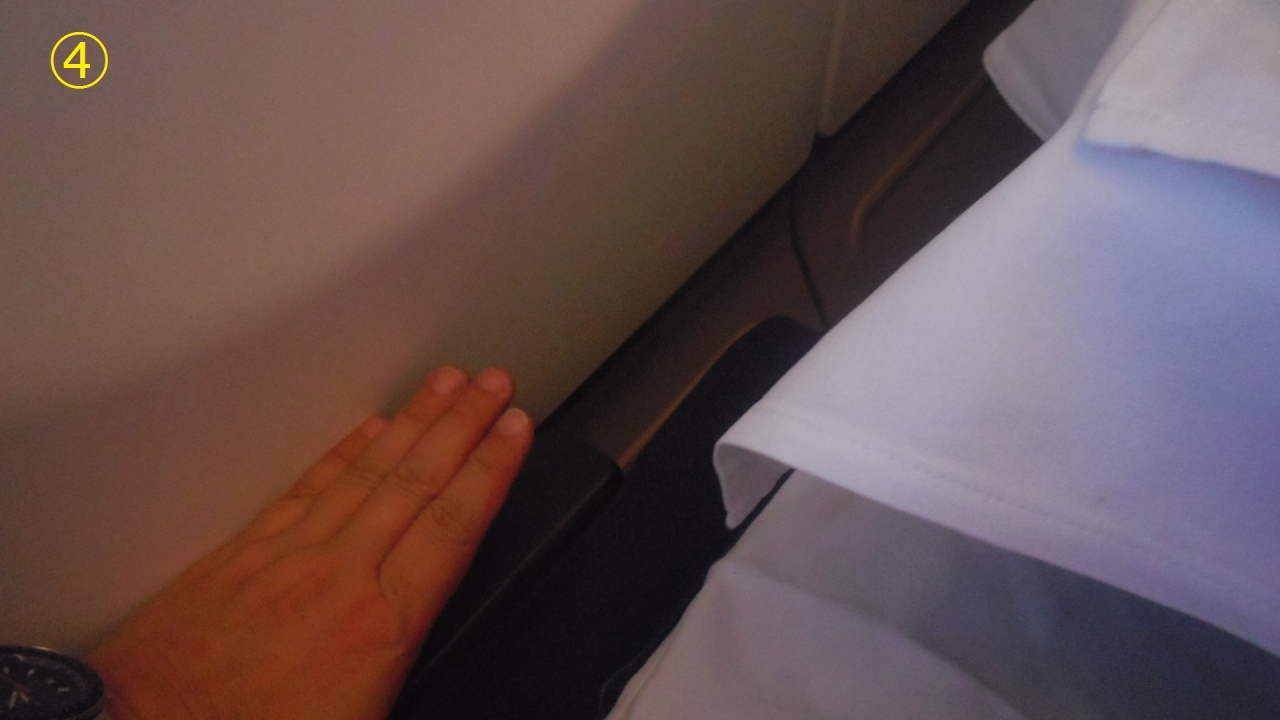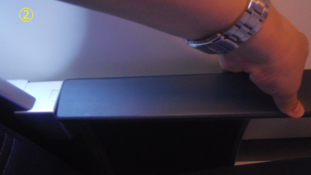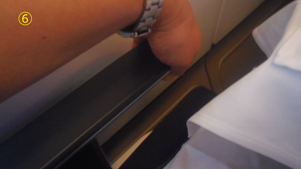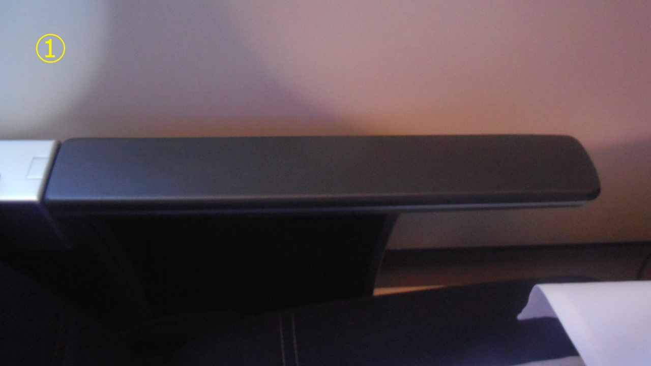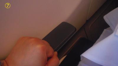 マレーシア航空 A333ビジネスクラスシートのひじ掛け収納方法を説明します。座席は7Aなのでひじ掛けは窓側になります。
