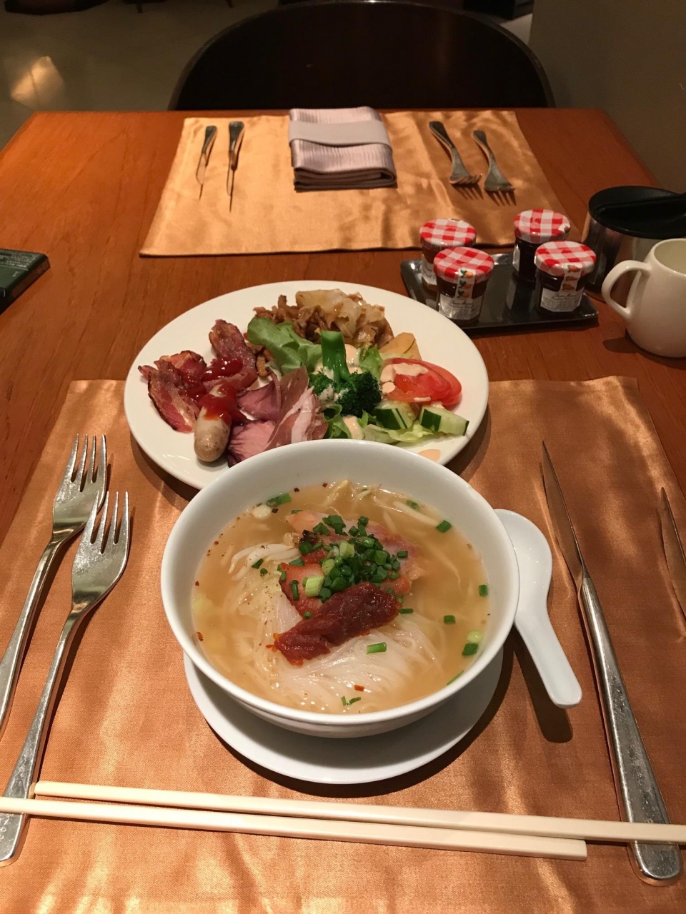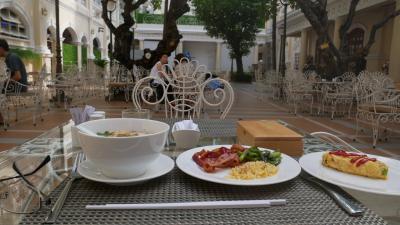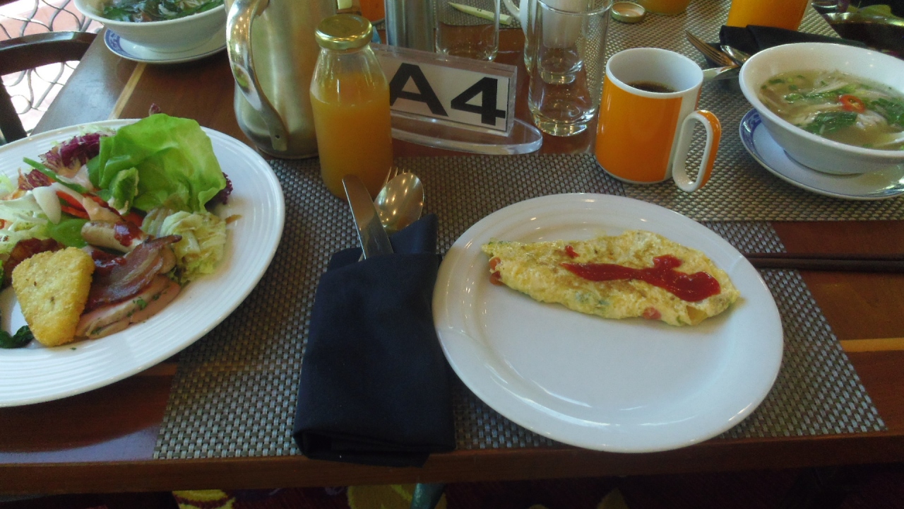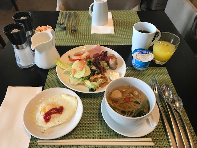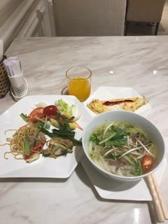 朝食では、麺類(フォーやうどん)、卵料理は作ってもらえます。日本的なメニューも多数あると思います。コーヒー類を持ち出すことができ、ホテル入り口横のテラスで寛ぐことができました。