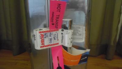 写真は、事務所でもらった受付票(問合せの電話番号に印してくれています)と次の日(6/3)に乗せられ遅れて届いたスーツケースです。