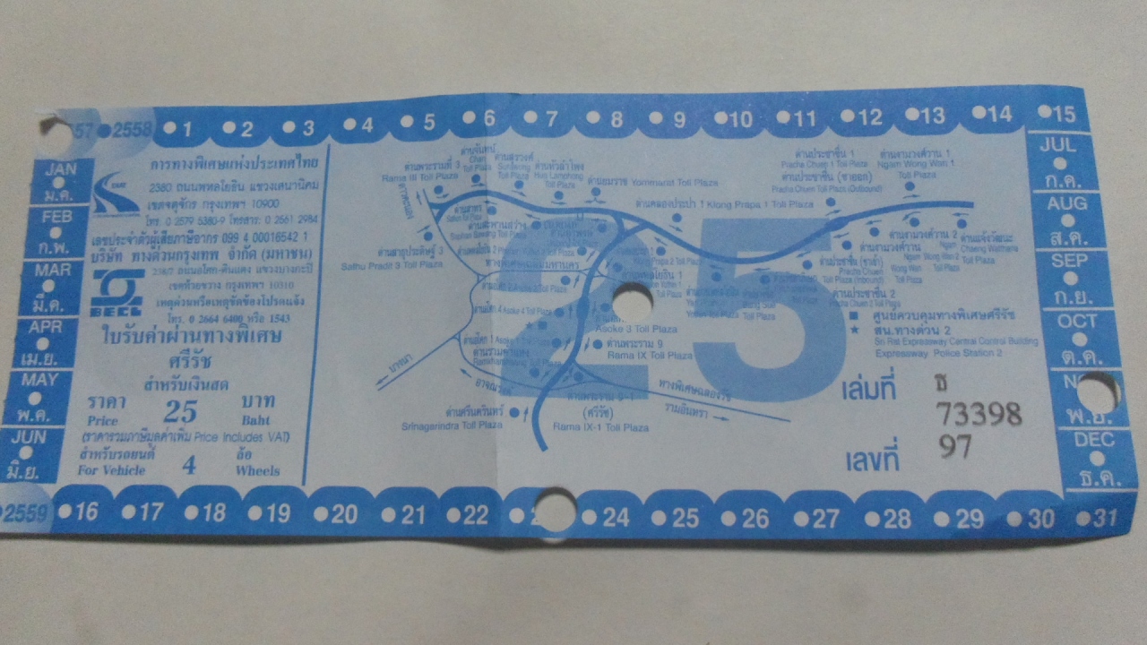 別に高速代50THB+25THBが必要です。高速入口で料金を払ってくれとのことで100THB渡し、2回目の支払いが終わったら、おつり(25THB)と高速の領収書もキチンと渡してくれました。