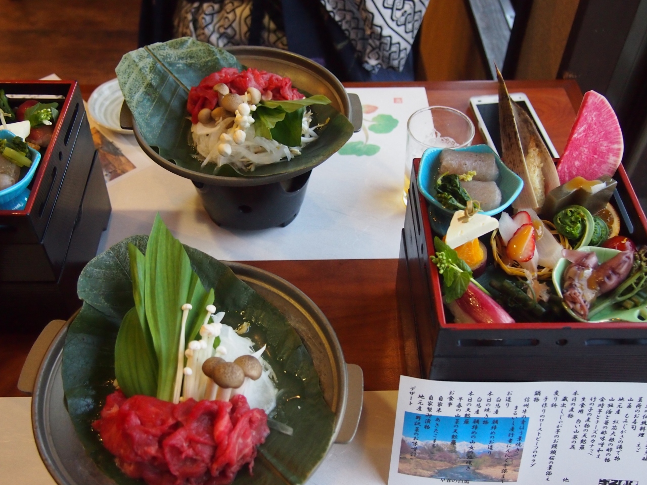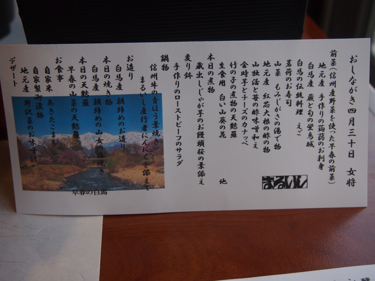 料理の美味しさ、温泉の良さ、接客の良さ、そして白馬の景色の良さにひかれて、再び訪れました。決して新しい旅館ではありませんが、出来るサービスはしつくしている感があります。食事は写真の通り、綺麗なお品書きがつきます。温泉はアルカリ泉でぬるぬるの美人の湯です。朝食時には各テーブルごとに今日の予定を聞いてくれてアドバイスをしてくれます。まさに細かなところに気が付くサービスを心掛けている宿です。