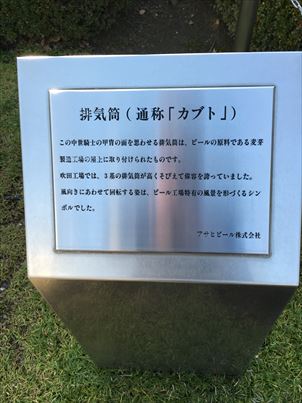 アサヒビール吹田工場 (スイタコウジョウ)では、排気筒の通称カブトを見る事ができます。この中世騎士の甲冑の面を思わせる排気筒は、ビールの原料である麦芽製造工場の屋上に取り付けれたものです。この吹田工場には、3基の排気筒が有るとの事です。ぜひ、一度、行ってみてください。