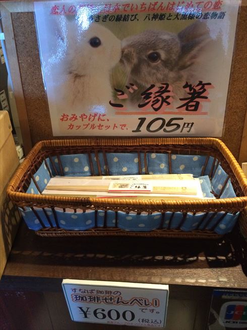 おさかなダイニング ぎんりん亭には、ご縁箸がおいて有ります。この箸は、おみやげとしておすすめで、かっぷるセットまで有る。そんなお箸です。これは、うさぎの縁結びからあやかっています。ぜひ、一度、購入を検討してみてください。