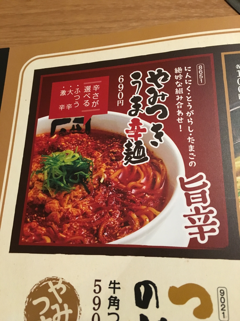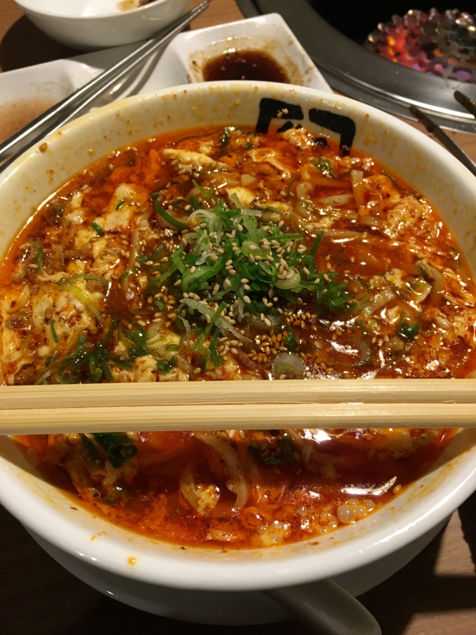 牛角では、お肉の他にも麺がうまいですね、おすすめなのが、やみつき旨辛麺ですね