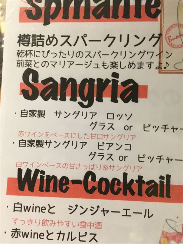Buono! ヨシザキ (ボーノヨシザキ)では、飲み放題に、サングリアロッソが有ります。このお酒とハムやきのこがとても相性が良くておすすめの一品です。お酒も飲みやすので飲み過ぎに注意ください。それ以外にもいつもと違った飲み物が有ります。ぜひ、一度、食べてみてください。