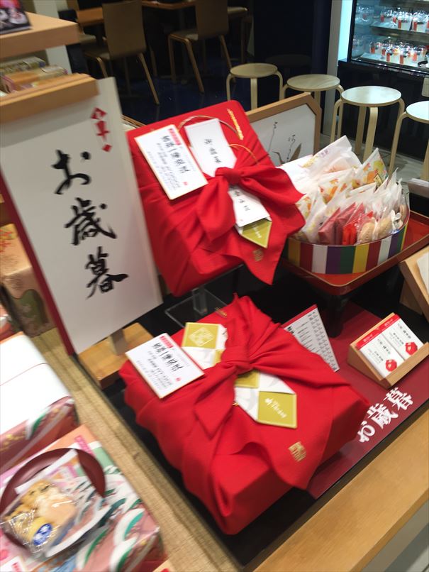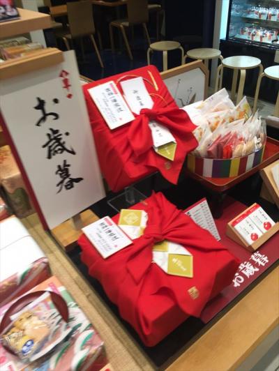 お歳暮の時期に喜ばれるお菓子です。包装も原色を使って、目立つ色使いで、特に、京都らしい雰囲気を醸し出しています。