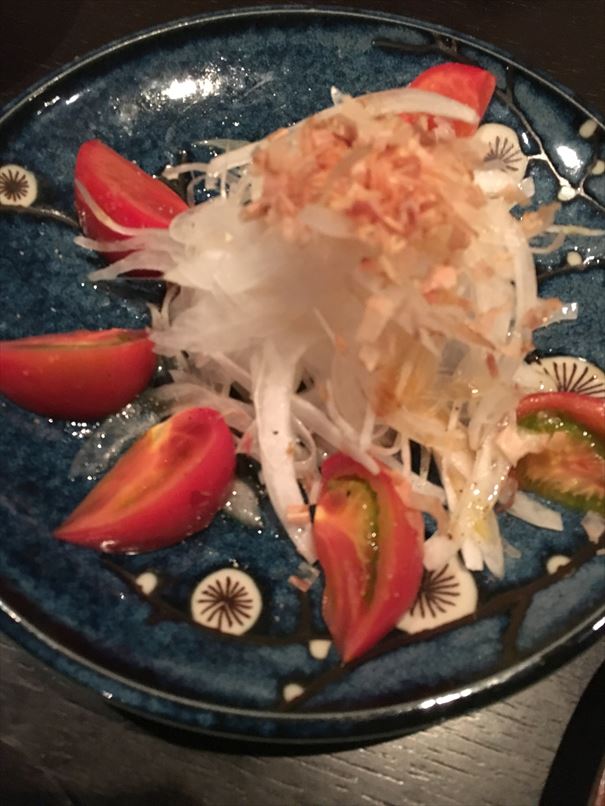 おすすめは、このトマトと新玉ねぎのサラダですね、たまねぎがしゃきしゃきしていて、生ビールとの相性がとても良いです