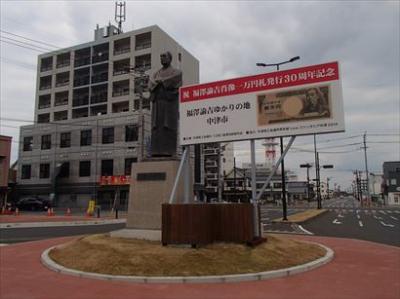 中津、ゆかりの地として福沢諭吉の銅像が有ります。この銅像をバックに記念写真を撮ってみては、一万円札も掲載されていますので、判りやすいです。