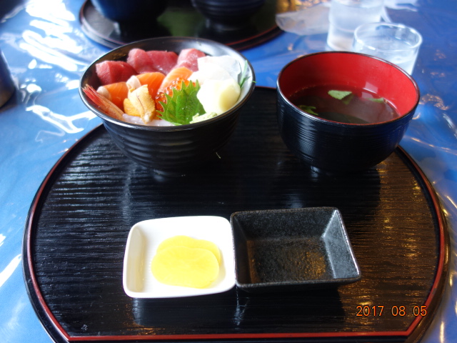 「2002-2003年版の北海道マップル」の釧路グルメ欄の一番後ろに紹介されていたのが「魚市食堂~”魚のプロたちが集まる店”」。行ってみたくなりました。カーナビに「マリントポス釧路」を入力、とりあえず向かいました。私は何もない港である現地に到着したのち、さらに探しました。釧路市漁業魚市場のビルの入口に「マリントポスはこちら」と看板を見つけました。誰もいないビルを入り、エレベーターで上の階に上って渡り廊下を渡って、下の階に降りたところに食堂を見つけました。やっと到着しました。名前は変わっていましたが、「釧ちゃん食堂」を発見しました!マリントポス釧路のビルを後ろからみていた訳で、何のビルがようわからんかったということです。簡単にいうと、到着するのに苦労したという話。お店に入ったのは11時半前。お客さんは我々以外に2組。1人前1,200円の海鮮丼を注文しました。息子と2人なので2,400円。ビールはがまんしました。出てくるのに時間がかかりました。味、美味しかったです。テーブルの横に写真が貼ってました。店の女の人らしき人と琴奨菊関の2ショット。おすもうさんも来ることがあるのだなと納得しました。12時前になると、どんどんお客さんが入ってきました。一杯になりました。ビジネスマンがお客さんをお連れするのにも使ってました。