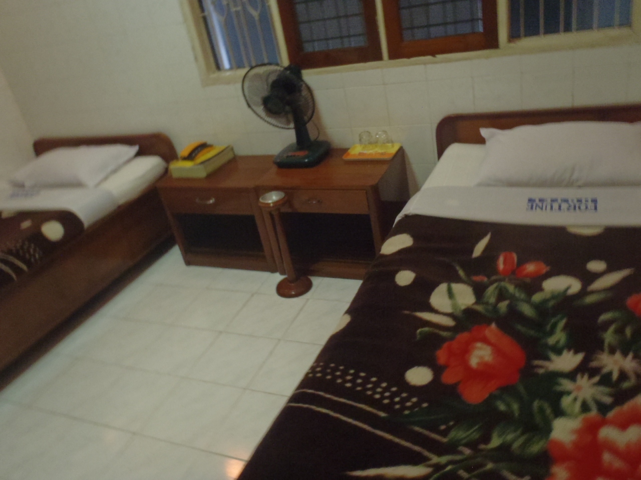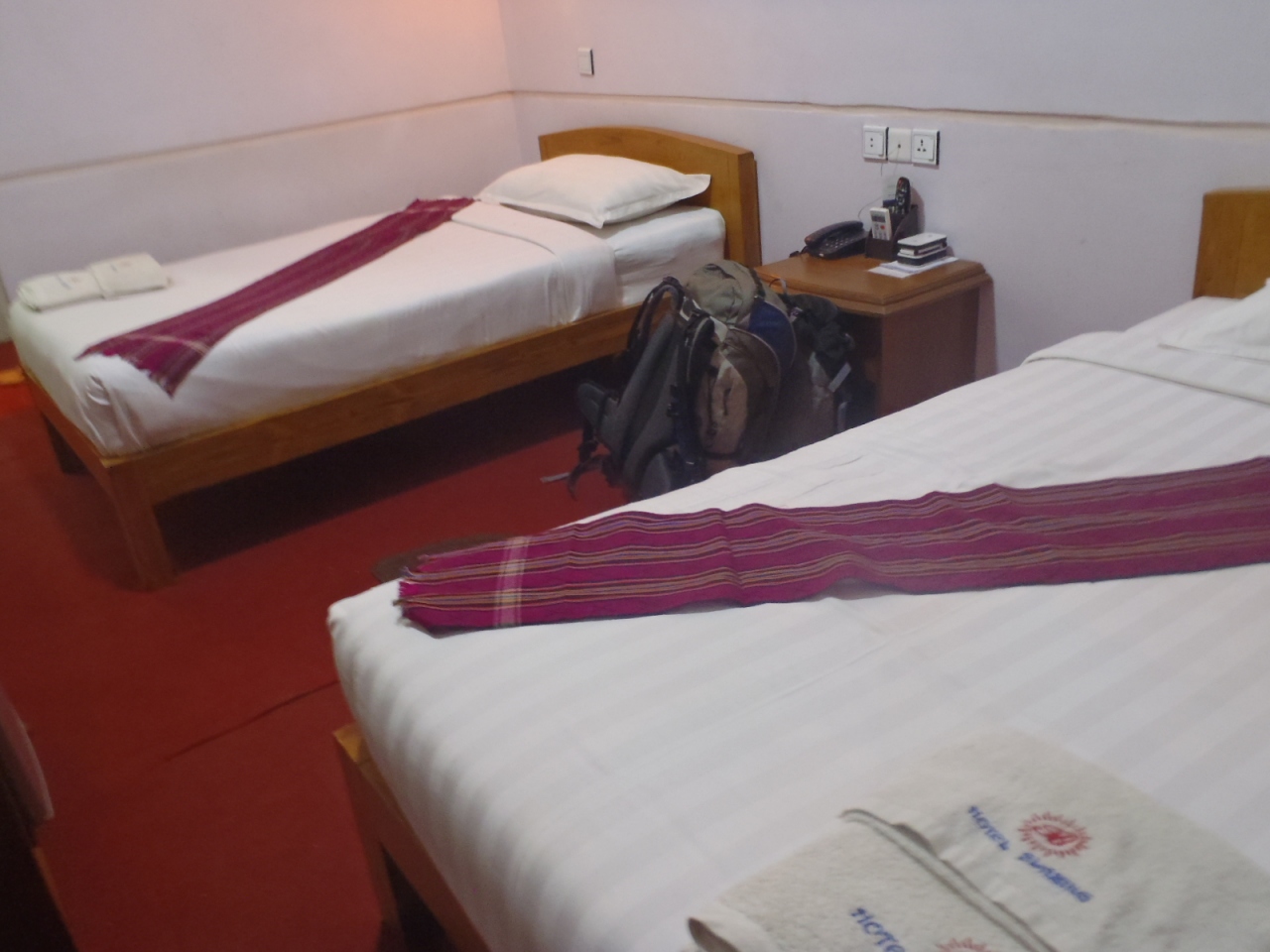 平成27年5月上旬に2泊しました。このホテルは、市内中心部にあり、ゼーチョーマーケットまで徒歩圏内です。このホテルは、共同トイレ、共同シャワー、共同洗面所です。エレベーターはありません。部屋はいたってシンプル。窓はとりあえずあるのですが、隣のビルの壁がすぐそこに見えます。窓はあきません。エアコンはよく効きました。冷蔵庫はありません。ベッドはツイン。真ん中を通路に壁にくっつく感じで2つあります。朝6時におきて、顔を洗いに行った時、ホテル男性従業員お二人がゴシゴシ、トイレとシャワールームを洗っていました。おかげさまで、このホテルに滞在中、とても気持ちよくトイレ・シャワールームを使うことができました。フロントは、全員若い男の子たち。感じはよかったです。この季節、マンダレーは暑すぎて、あまりお客さんはこないのでしょうか?運よく、階段を1F上がるだけの部屋をあてがってもらえました。ひょっとすると、ベストシーズンには4Fくらいまで一杯になるかもしれません。その際は、階段の上り下りがたいへんかも。ホテル周辺には、地元の人々に人気の安レストランもあり、食事面では不自由を感じませんでした。総じて、お手ごろ価格で気持ちよく泊まれたのでよかったです。