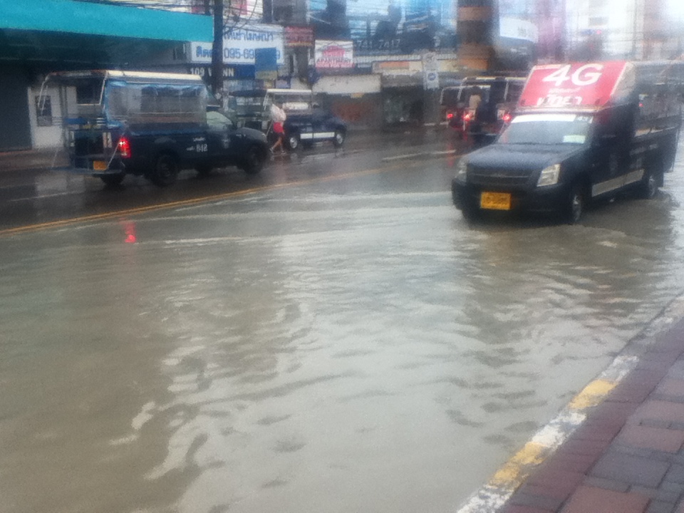 タイでは、5月から11月までの約半年間、雨季があります。2015年10月上旬の午前中、雨の中、バンコクからパタヤに移動しました。パタヤの北側にあるバスターミナルからビーチロードに出て、ウォーキングストリートまでソンテウで移動しました。セントラルロードとの交差点付近の道路にはかなり水がたまっていました。一面、水浸し。ソンテウは車高が高いので我々の足が水に漬かることはありませんでしたが、車高が低い車では中まで浸水してくると思われます。この季節にパタヤに行かれる方は、パタヤの道の排水施設が全然なってないということを頭に入れておく必要があります。
