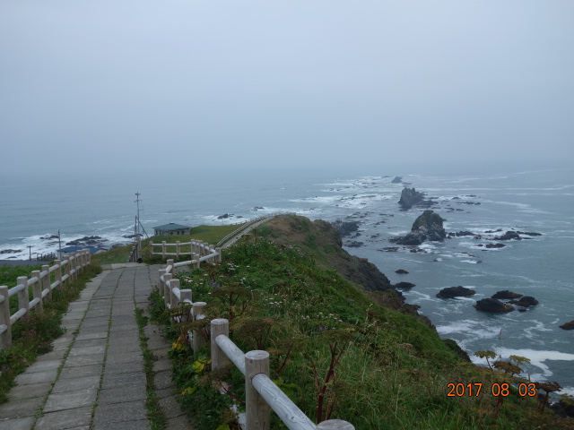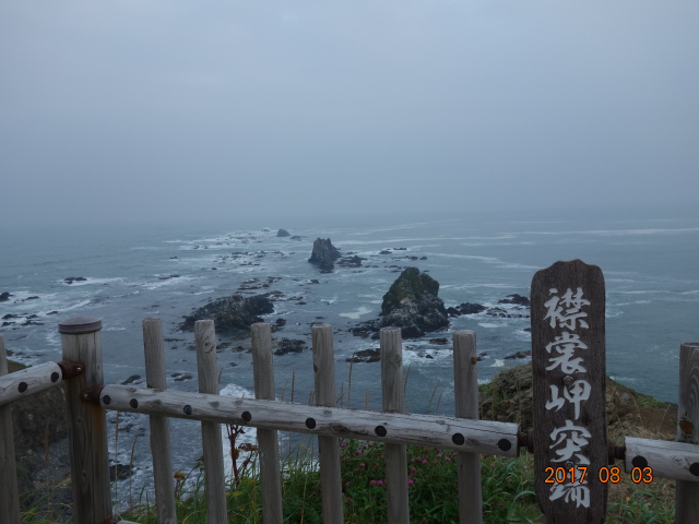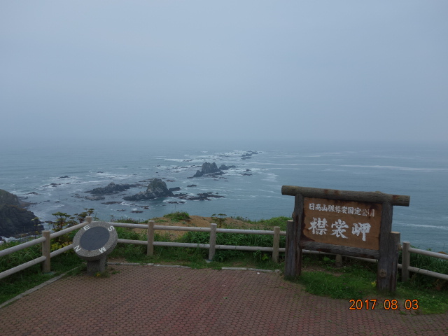 お昼過ぎに新冠町をスタートし、襟裳岬に車で向かいました。途中で昼ごはんを食べたり、仮眠をとったりで、襟裳岬到着は、夕方5時頃になりました。日高山脈の南端とも言われている襟裳岬、ごつごつした岩が特徴的です。日高山脈の最高峰「幌尻岳」から「襟裳岬」まで、えんえん山を連ねているんだな-と考えるだけで感無量です。森進一さんの襟裳岬の歌碑がありました。“北の街ではもう、悲しみを暖炉で燃やし始めてるらしい・・・・・”と歌いながら、突端まで行きました。風が強く、ウィンドブレーカーを着てちょうど良かったです。観光客は、我々以外に3人でした。晴れてはいませんでしたが、ガスがでておらず、綺麗に周りが見通せたのでラッキーでした。歩いたり、眺めたりで約1時間、襟裳岬でのんびりしました。おすすめの場所です。