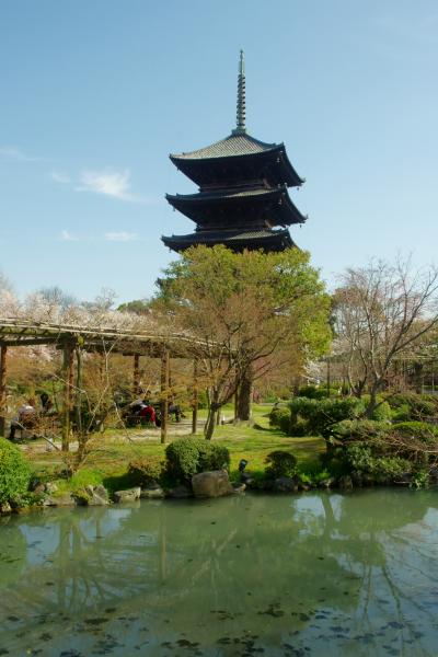 桜を見ようという方達ががたくさんみえてます。奥には五重塔。