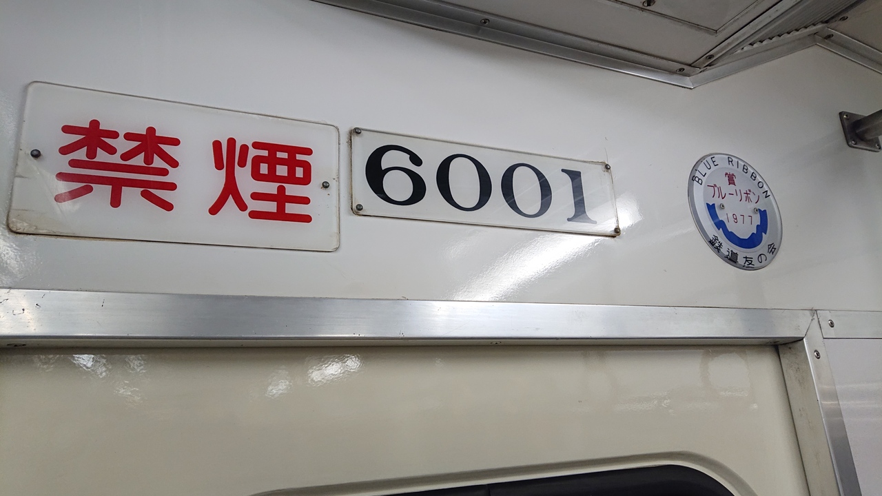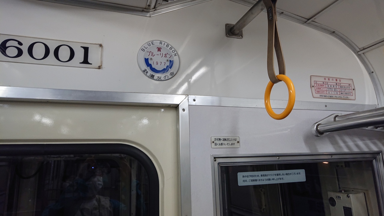 平日の夜に、豊田市駅から知立方面の列車に乗車すると、車内の車端上部に、何やらプレートが掲示されているのを発見。近づいて確認すると、1977年に、ブルーリボン賞を受賞した記念のプレートでした。名鉄6000系電車の歴史を感じるとともに、丈夫で長持ちな車両なのだな、と感心しました。