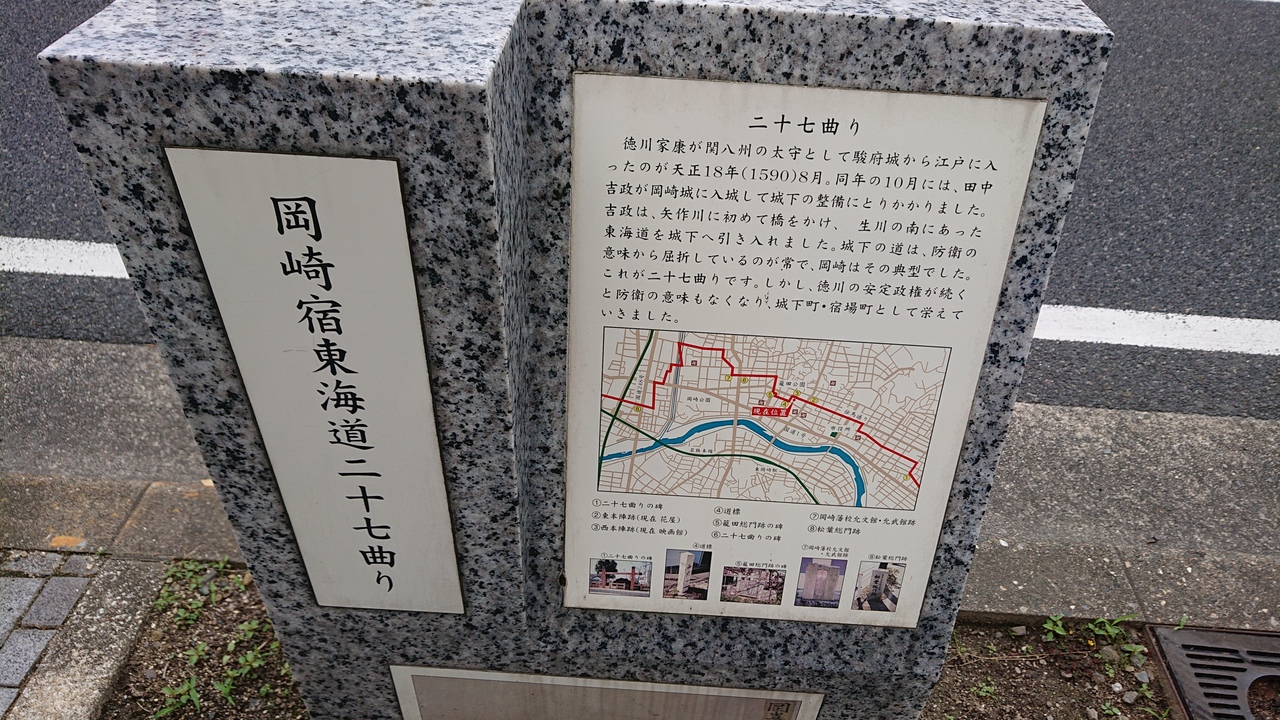 旧岡崎宿付近を歩いていたところ、偶然にも二十七曲りの案内表示を発見しました。豪華な施設をお金をかけて造るといった観光施策ももちろん面白いですが、今回発見した案内表示のように、地味ながら趣があり、分かりやすいものも、また別の良さがあると感じました。