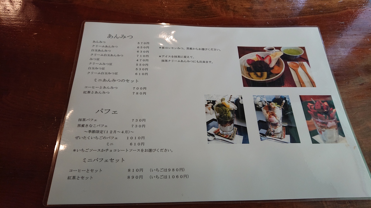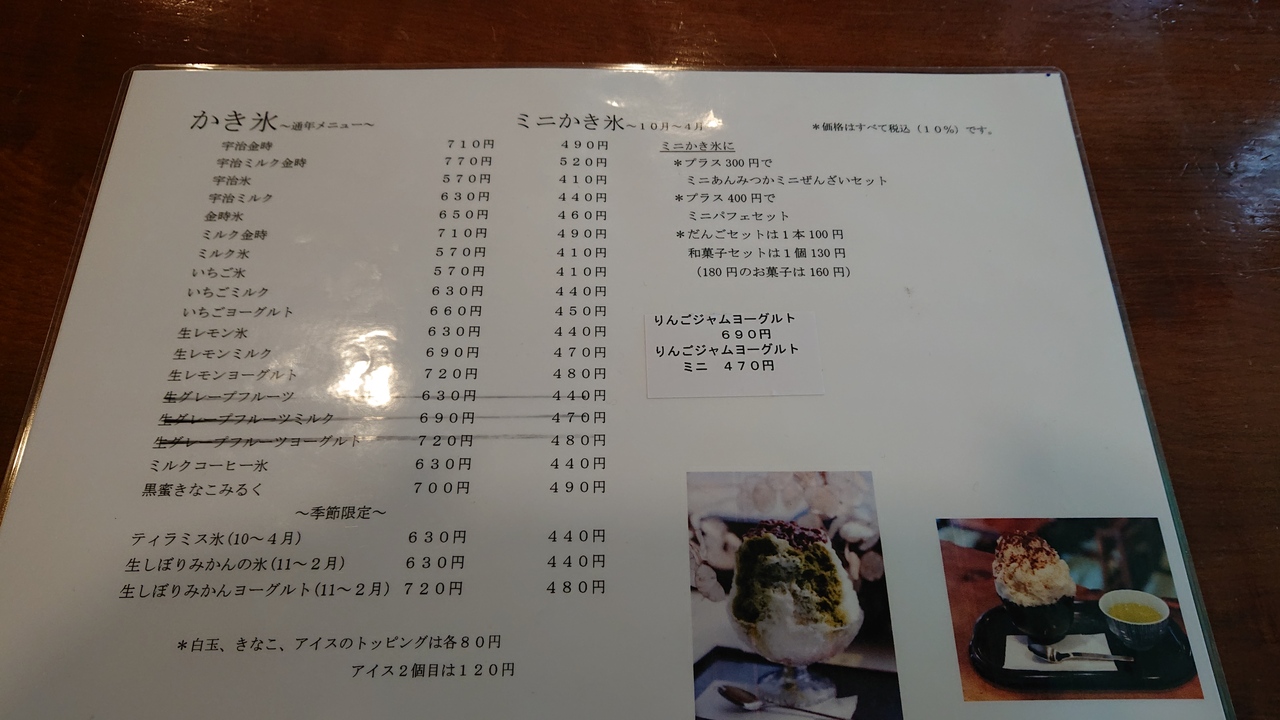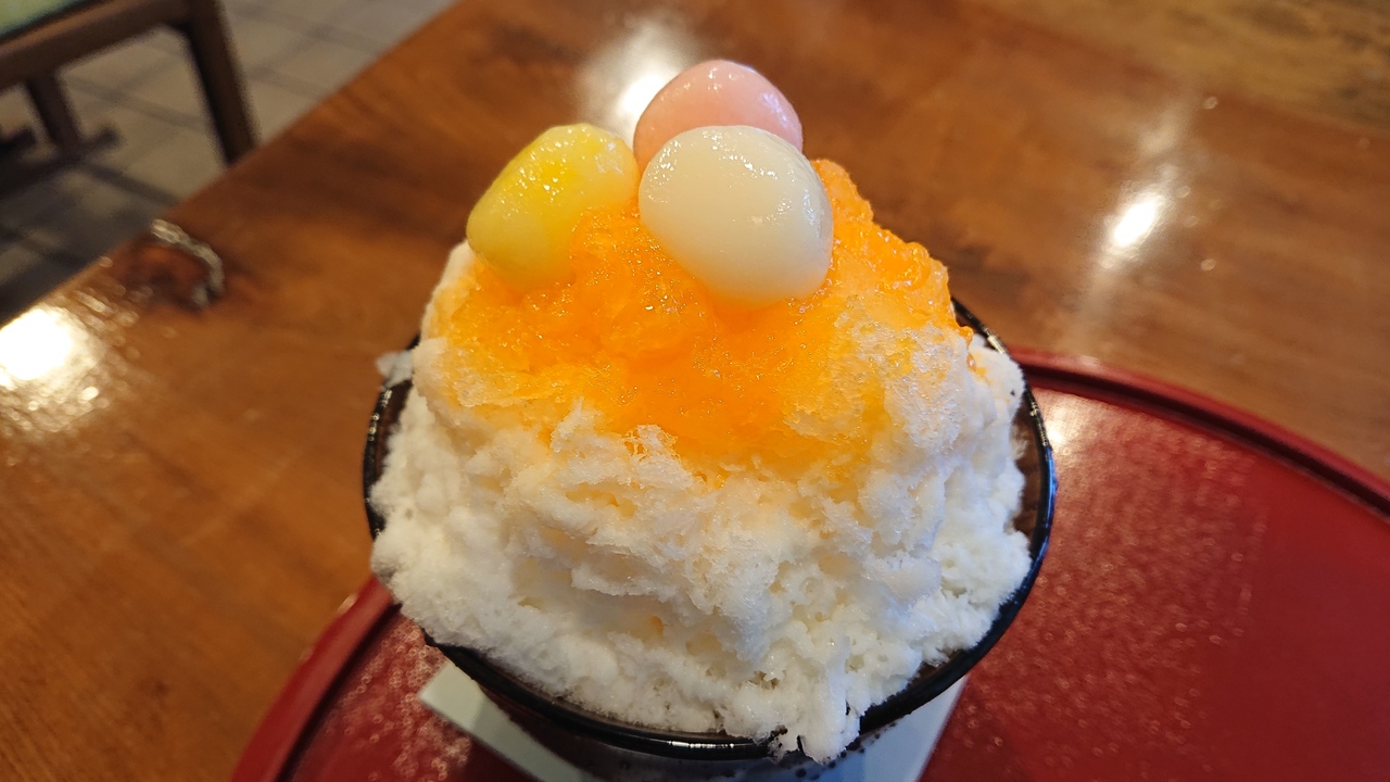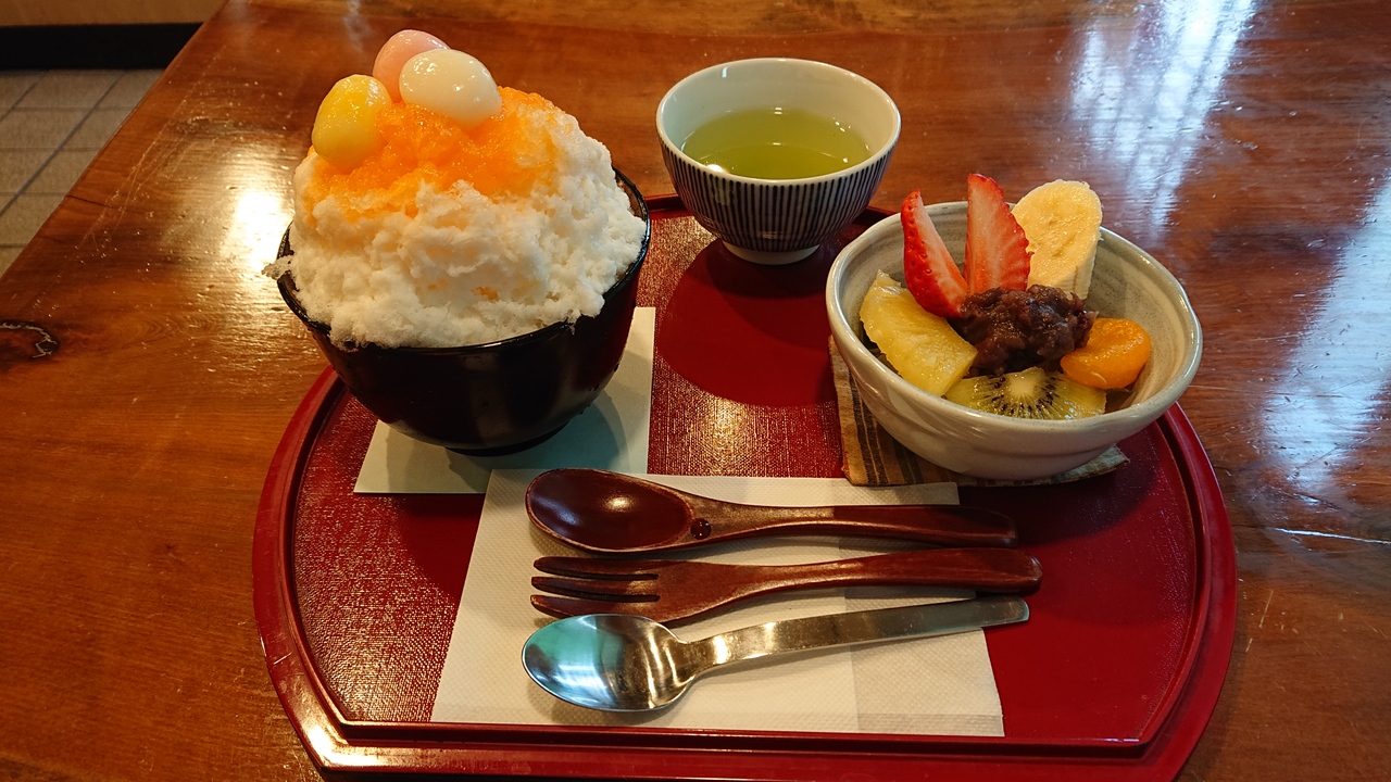 秋葉神社近くの和菓子屋兼甘味処です。今回は、季節限定のかき氷小サイズ(生しぼりみかんヨーグルト味・白玉追加)と、ミニあんみつのセット。それに加えてみたらし団子、と欲張りな注文をしました・笑