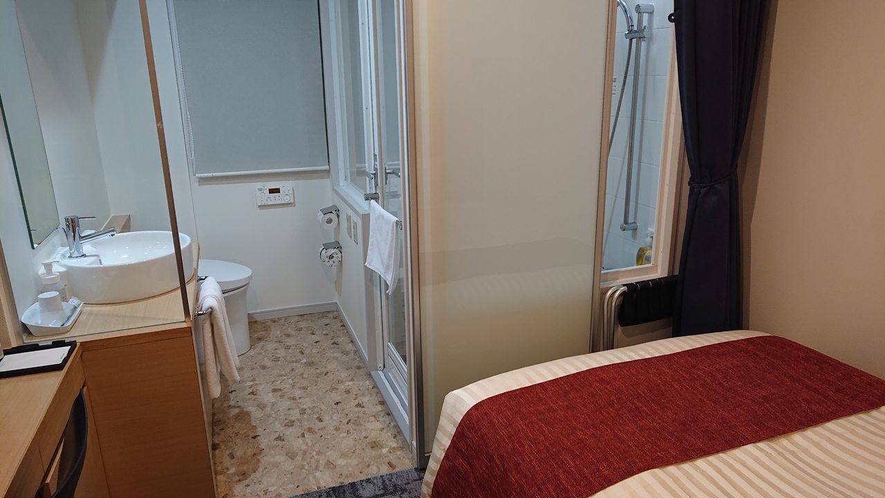 JR蒲田駅近くのビジネスホテルです。ドアを開けると、手前がベッド、奥が浴室とトイレという室内レイアウトとなっていました。また、浴室はシースルーのガラス張りとなっており、少しびっくりしましたが、利用に特に支障は無かったです。