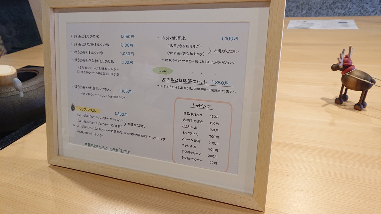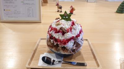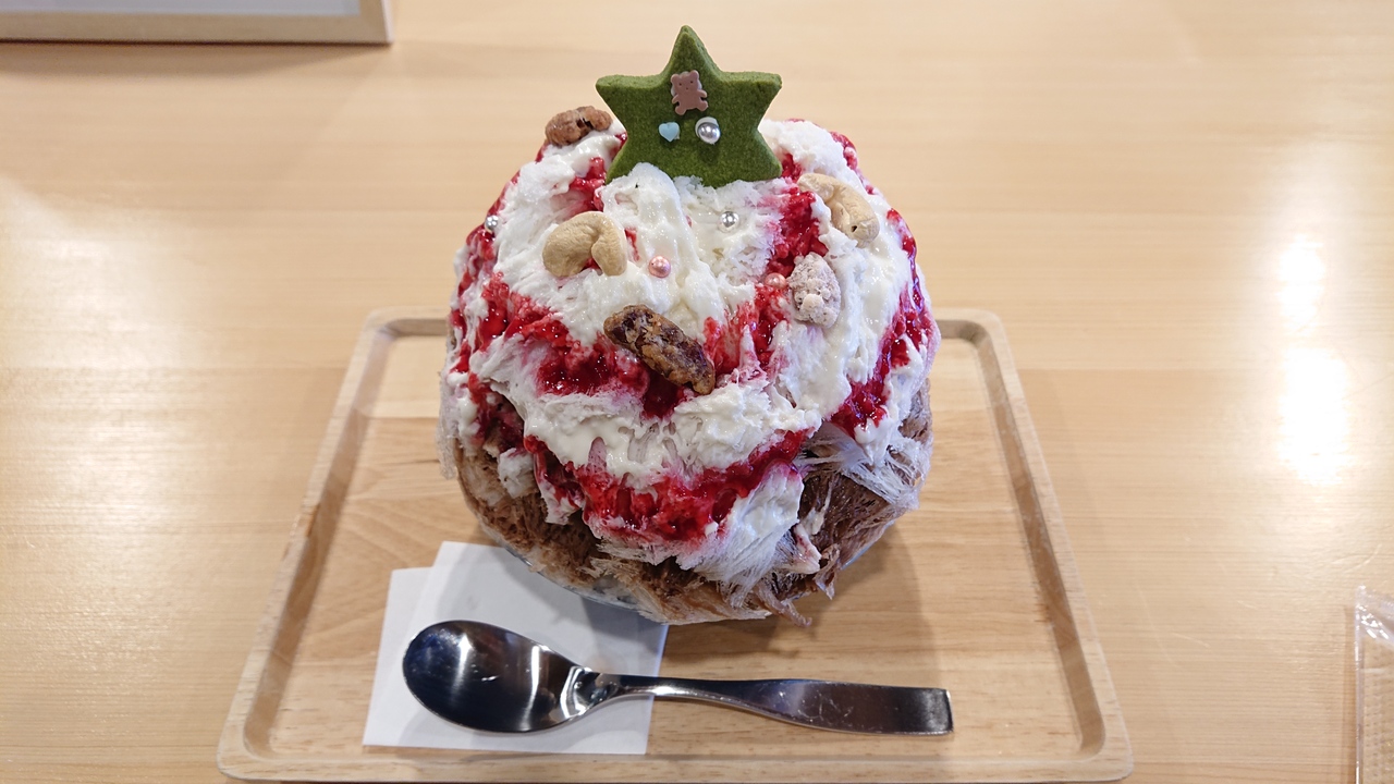 12月に訪問。テーブル上のサンタクロースの置物が、季節感を醸し出していました。今回は、クリスマス氷(ローズピューレ/レアチーズ /チョコ、のコンビ)を注文しました。基本的にはチョコレート味で、ローズピューレも結構主張している、レアチーズは控えめに存在している、といった味だなあ、と個人的には思いました。チョコレートのかき氷として、おいしかったです。また、クリスマスっぽさの点でも非常に高ポイントだと思いました。
