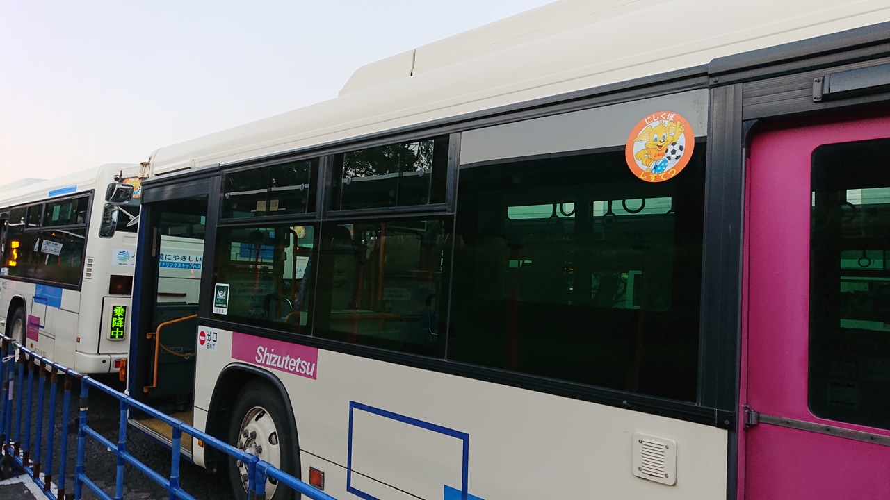 Jリーグ開催時の臨時便を、清水駅から日本平運動公園まで利用しました。使用されていたのは、一般の路線バス定期便と変わらないタイプの車両でした。お客さんをあまり詰めすぎずに発車。現在の時勢に配慮して運行してくださっているな、と思いました。