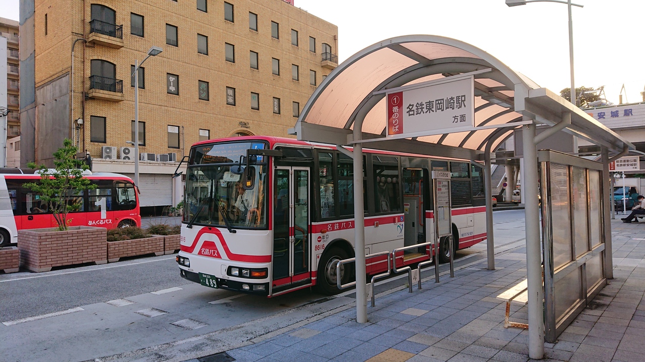 愛知県内に多くの路線網を持つのが、名鉄バスさんです。今回は、JR安城駅から、岡崎安城線の、東岡崎行きを利用しました。安城駅のバス停は、方面別に発着場所がわかれており、分かりやすかったです。平日の夕方でしたが、座席には余裕があり、お客さん全員が着席できました。