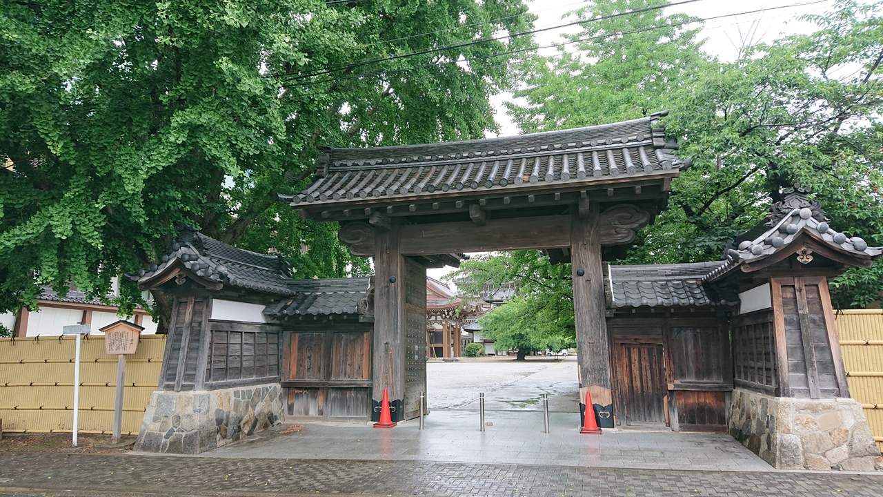 東門に歴史の重みを感じました。第二次世界大戦時の空襲で、東別院の多くの建造物が焼失してしまったなか、焼け残ったのがこちらの東門なのだそうです。切妻造りの屋根が特徴の高麗門に分類されるとねことですが、柱と屋根が直角に交わっており、立派だと感じました。