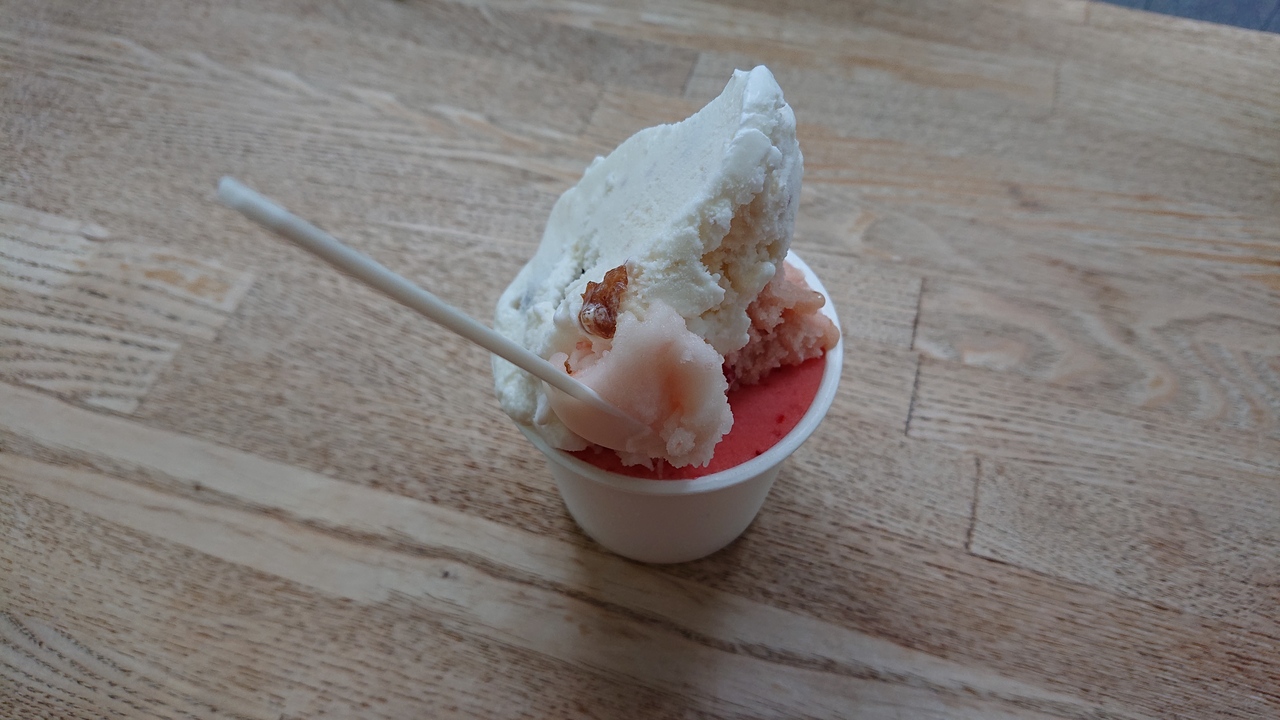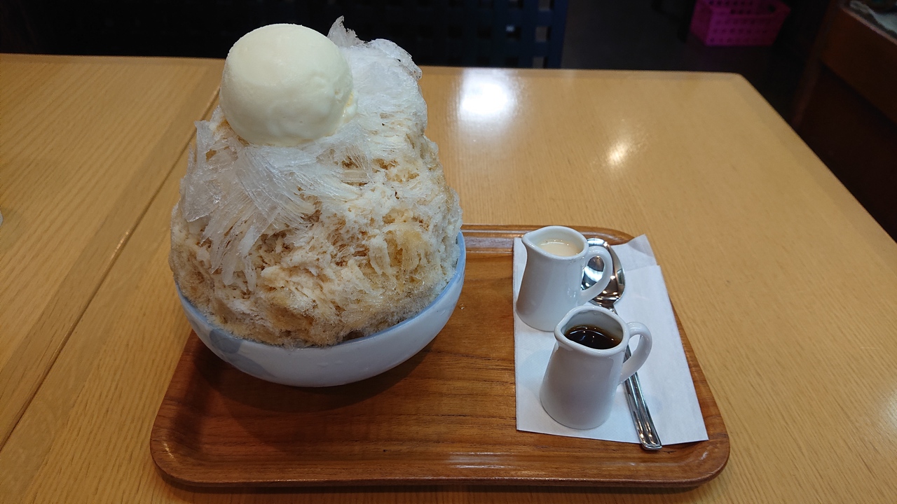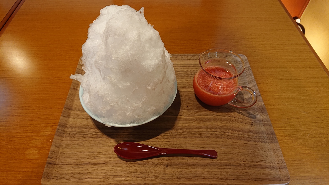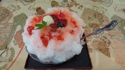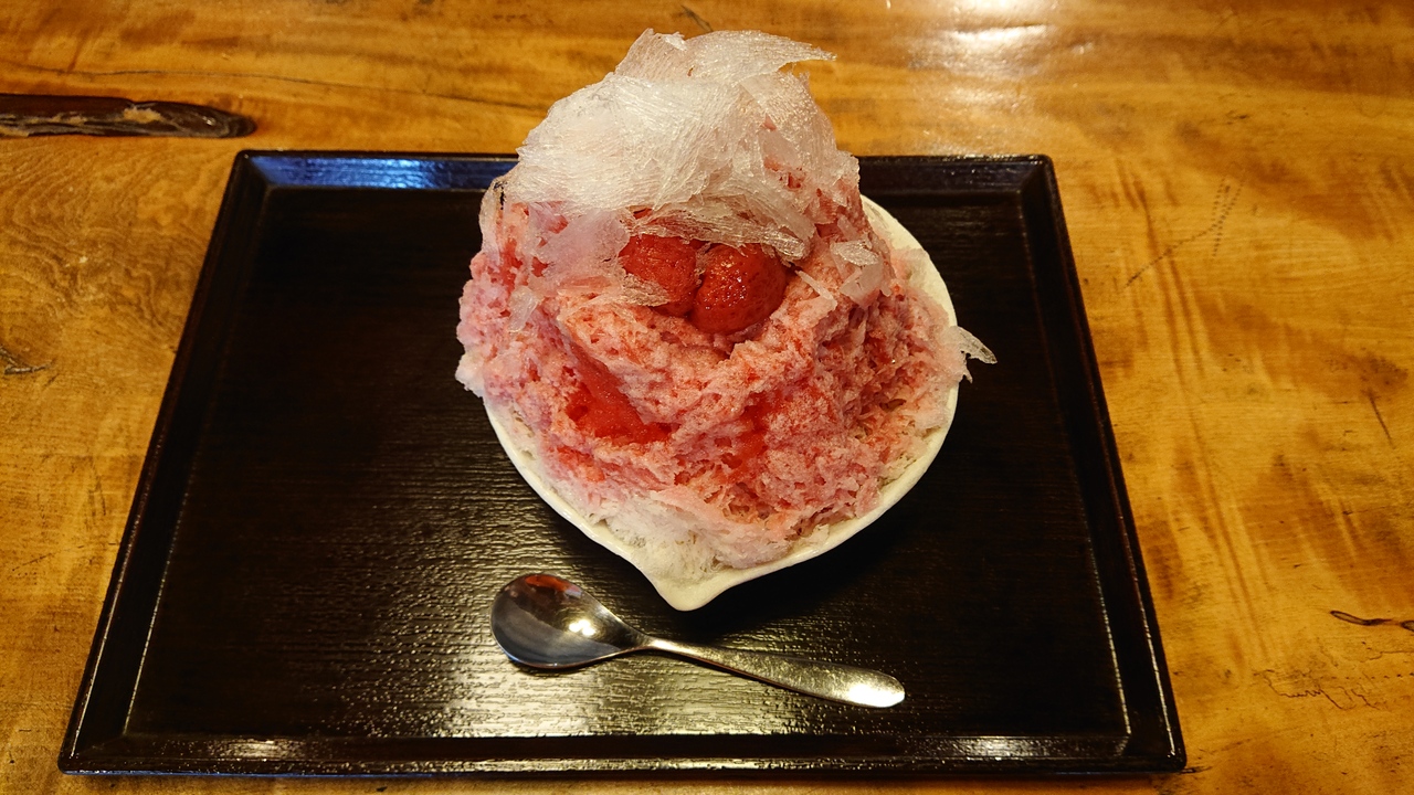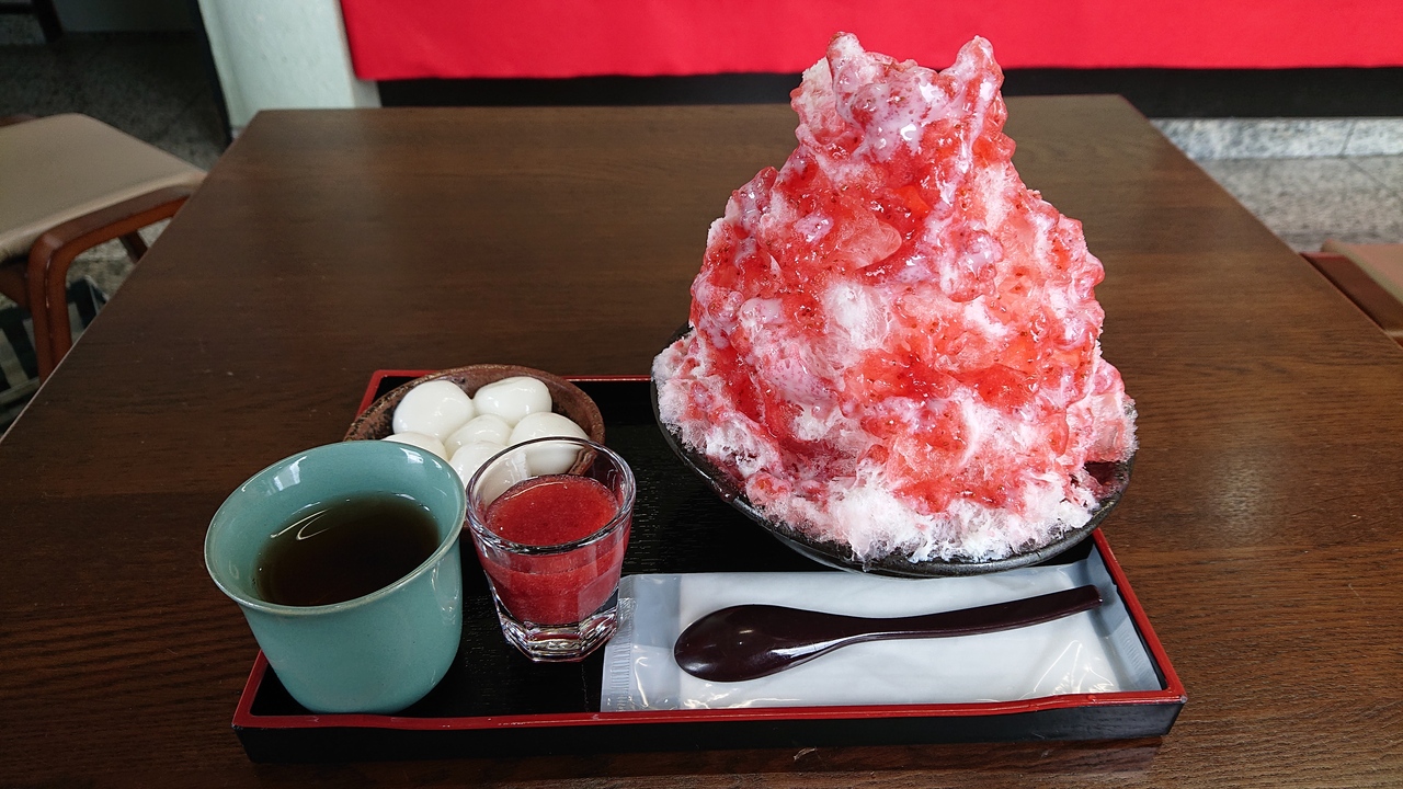 本宿にある和菓子屋さん兼甘味処です。交通量の多い国道沿いの立地だけに、駐車場も完備されています。今回は、生いちごミルク味のかき氷を注文。欲張って白玉を6個追加しました。かき氷は山盛りに器に盛られ、ビジュアル的にも涼める感じでした。なお、白玉はオーソドックスだと思いました。