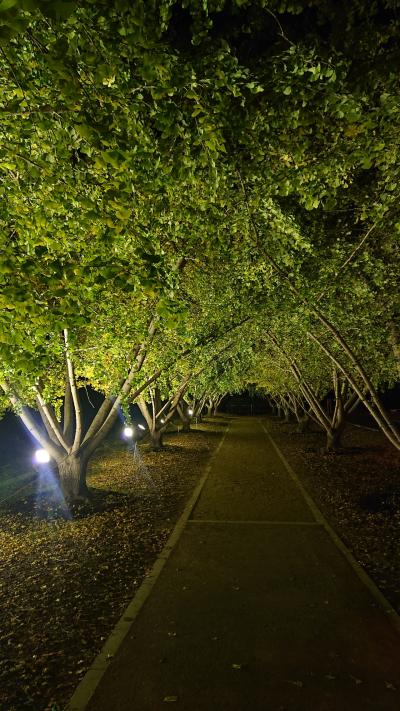 11月下旬の平日の18時以降に、まつり会場の一つである、「祖父江ぎんなんパーク」に訪問しました。会場からテレビ局の中継も行われる等、パーク内は賑わっていました。すでに日没時間は過ぎており、ライトアップは始まっていました。イチョウの木々が、照明に照される様は、思った以上に綺麗で、思わず見入ってしまいました。