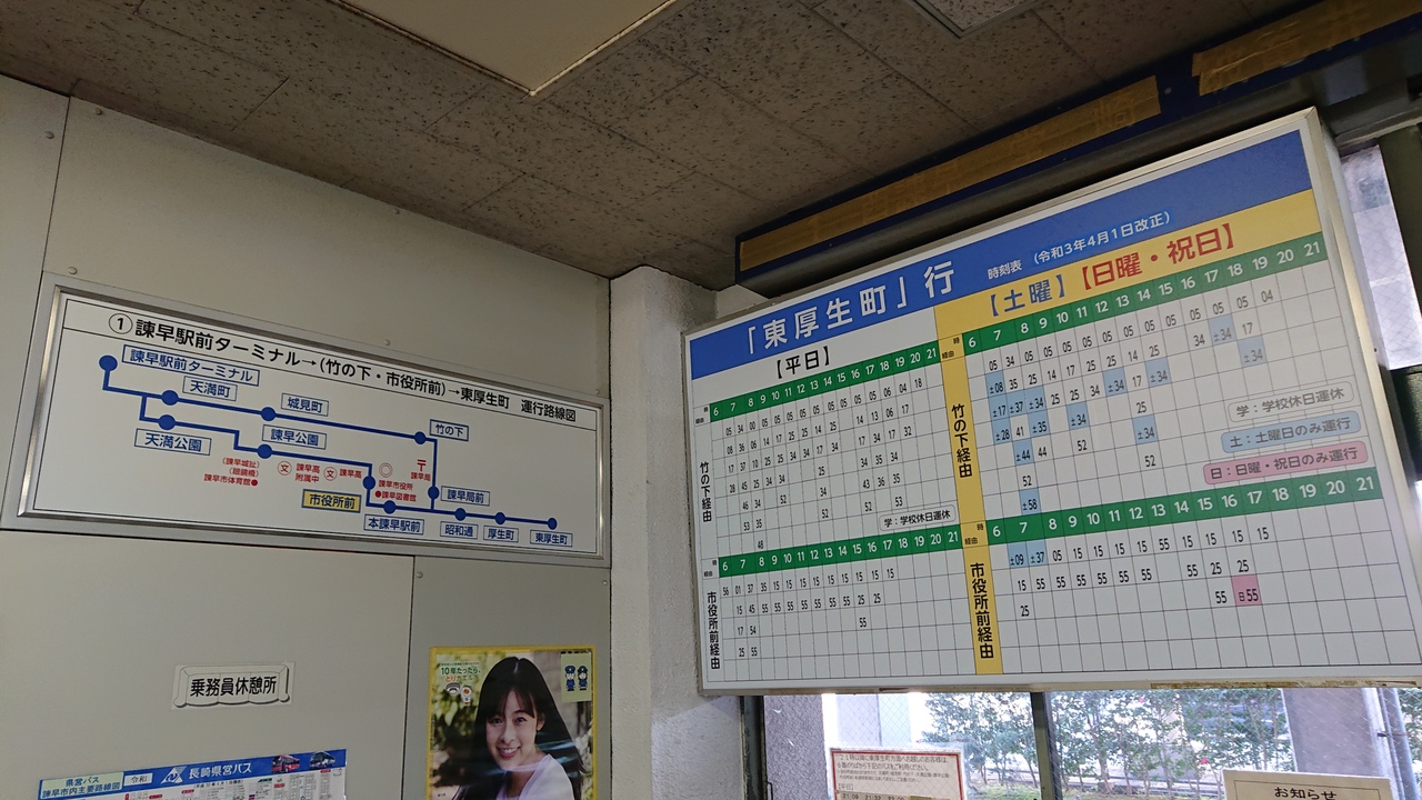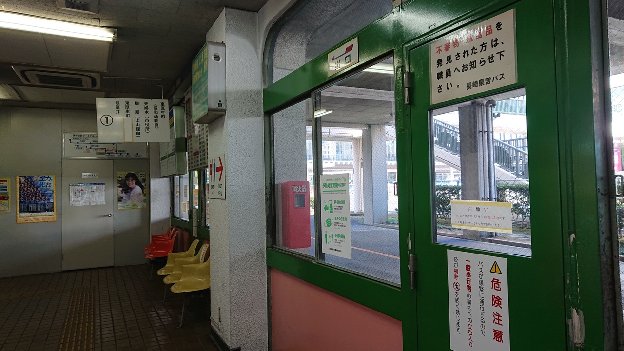 諫早駅前に立地する、バスターミナルです。11月下旬の休日お昼頃の時間帯に訪問しました。数多くのバスが発着しており、諫早における、交通の要衝であると言って間違いないと思います。昭和時代に造られた施設が、ベースはそのままに、使用されているようで、レトロな雰囲気でした。全般的に、昭和の雰囲気が色濃く残っているな、と感じました。