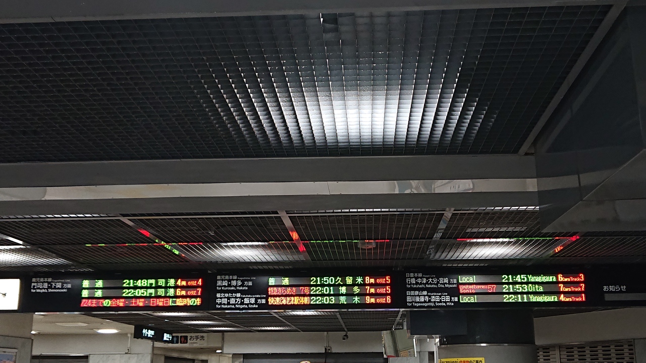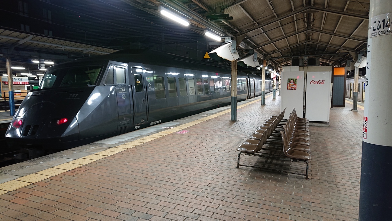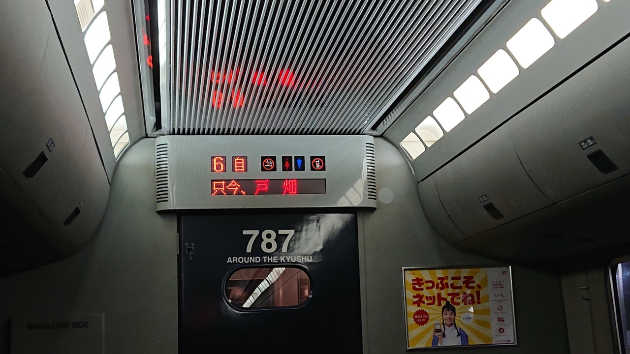 博多駅と、小倉駅又は門司港駅を結ぶ特急です。11月下旬の土曜日に、小倉駅22時1分発の「きらめき7号」で、始発の小倉駅から終点博多駅まで移動しました。グリーン車や指定席もありましたが、選択したのは自由席。土曜日の深夜帯とあって、自由席には十分余席がありました。車両はやや古い787系でしたが、自由席であっても、リクライニングシートで、楽に移動可能でした。