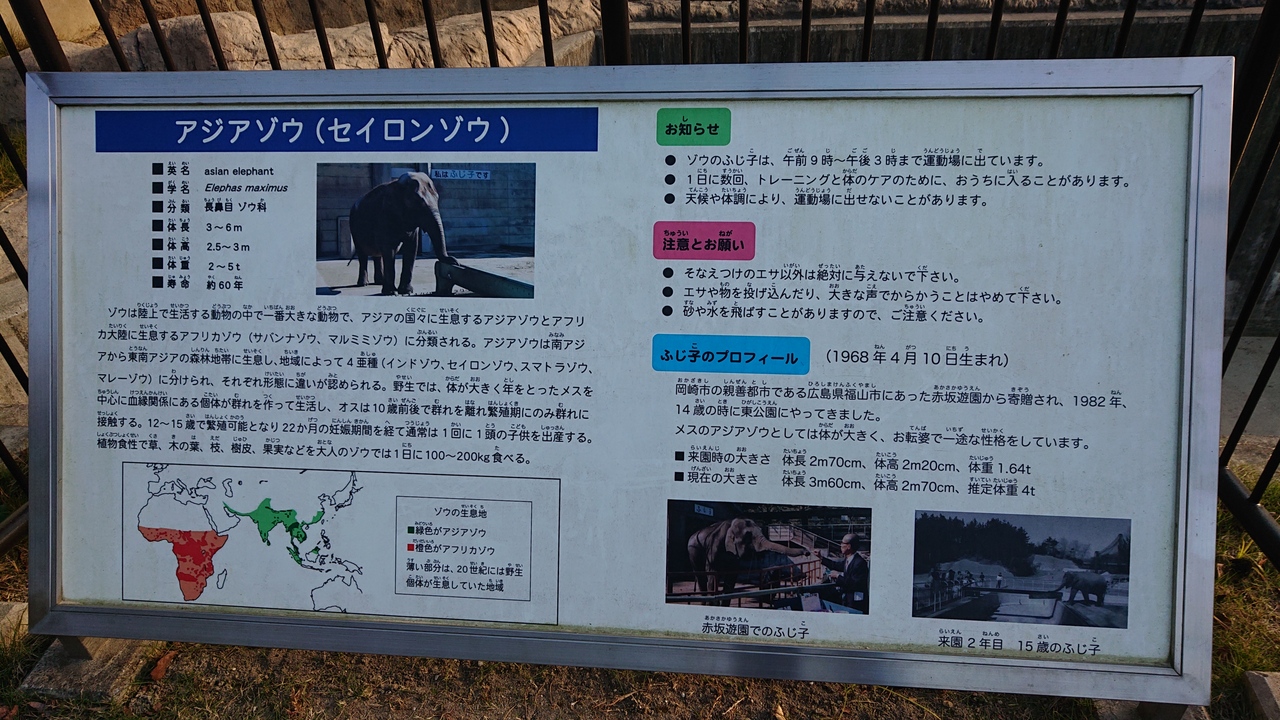 11月上旬の、15時台に訪問しました。動物の展示終了の目安である、16時に近い時間帯でしたが、園内には、一定程度の人出がありました。今回特に印象に残ったのは、アジアゾウの「ふじ子」さん。飼育員さんから与えられた餌を、鼻を用いて食べるという、ゾウの特徴が出ている場面が見られました。