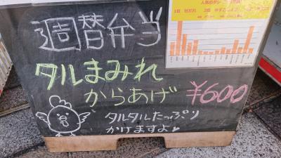 11月上旬の、平日の14時台に訪問しました。ランチには遅めの、この時間でも、店頭はお客さん多数でした。購入したは、週替わり弁当の、タルまみれからあげ弁当。ネーミング通り、タルタルソースが、たっぷりで、ご飯がすすむ、お弁当でした。