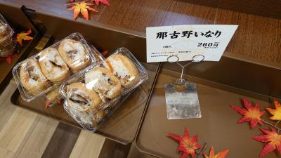 10月中旬の、朝9時台に訪問しました。お店の、商品棚に、もみじ風の装飾がなされていたのが、目につきました。さりげなく季節感を演出しているのが良いな、と思いました。購入したのは、那古野いなり。中身の飯に、しいたけや、にんじんが用いられ、ちょっと贅沢な感じのいなり寿司でした。