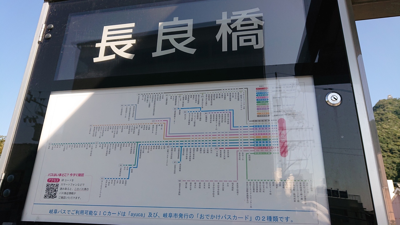 乗車、降車、双方で、長良橋バス停を利用しました。JR岐阜駅から、長良橋橋バス停までの区間は、非常に高頻度でバスが運転されており、あまりバスの時刻を気にすることなく、所用のため、又は所用を済ませ、バス停に向かうことができるな、と感じました。