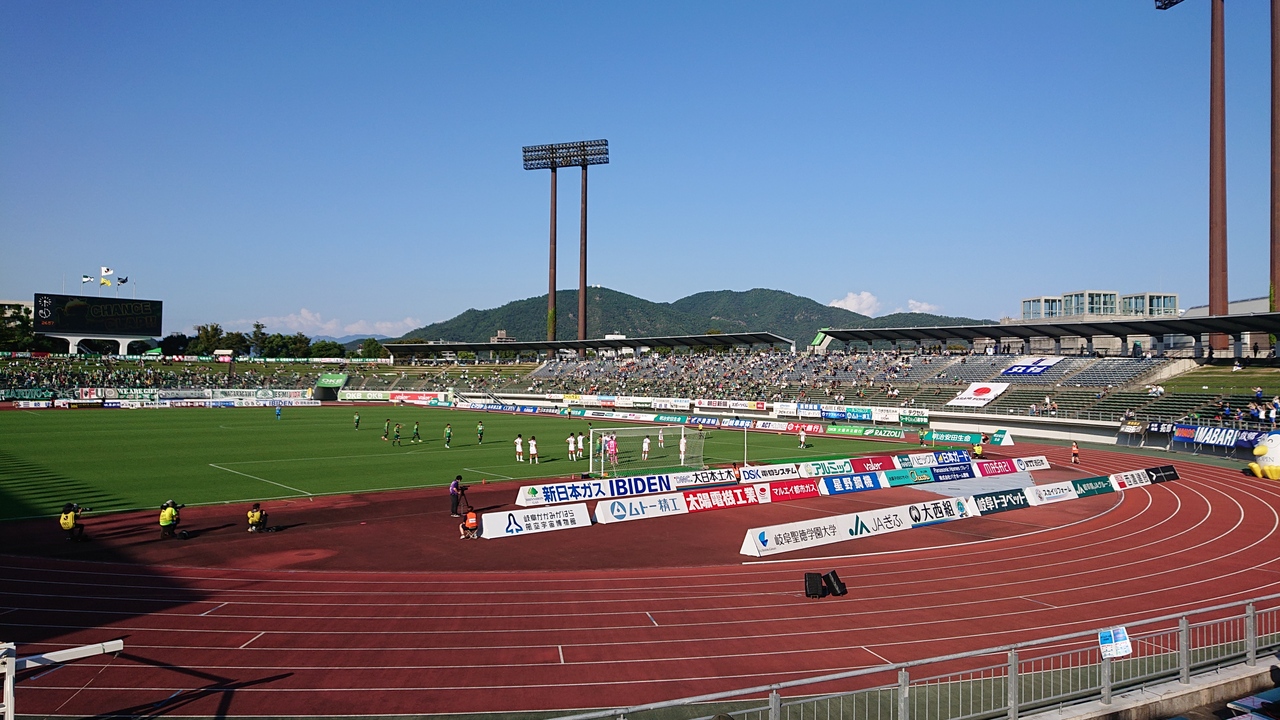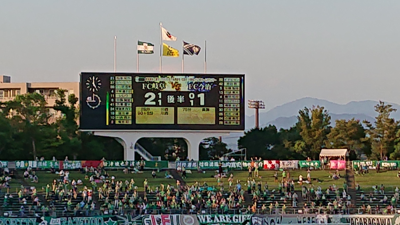 サッカーJ3リーグの、岐阜対今治を観戦しました。ビジター席寄りのホーム自由席での観戦でしたが、10月初旬の15時開始の試合とあって、陽射しが結構強く、暑かったです。屋根のない座席位置でデーゲームを観戦する際は、見易さの面でも、体調対策の面でも、帽子や暑さ対策が必須だと感じました。なお、試合はホームの岐阜が、後半の、長い追加時間の終了間際に得点するという劇的な内容でした。