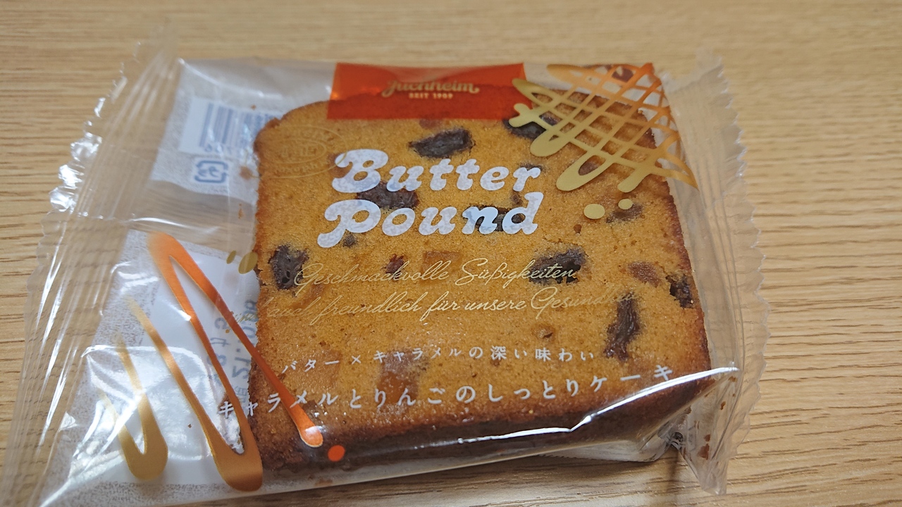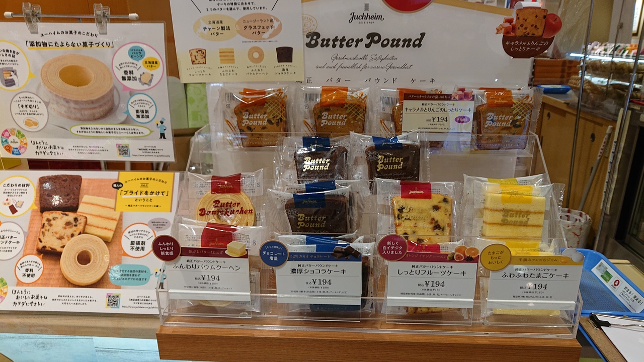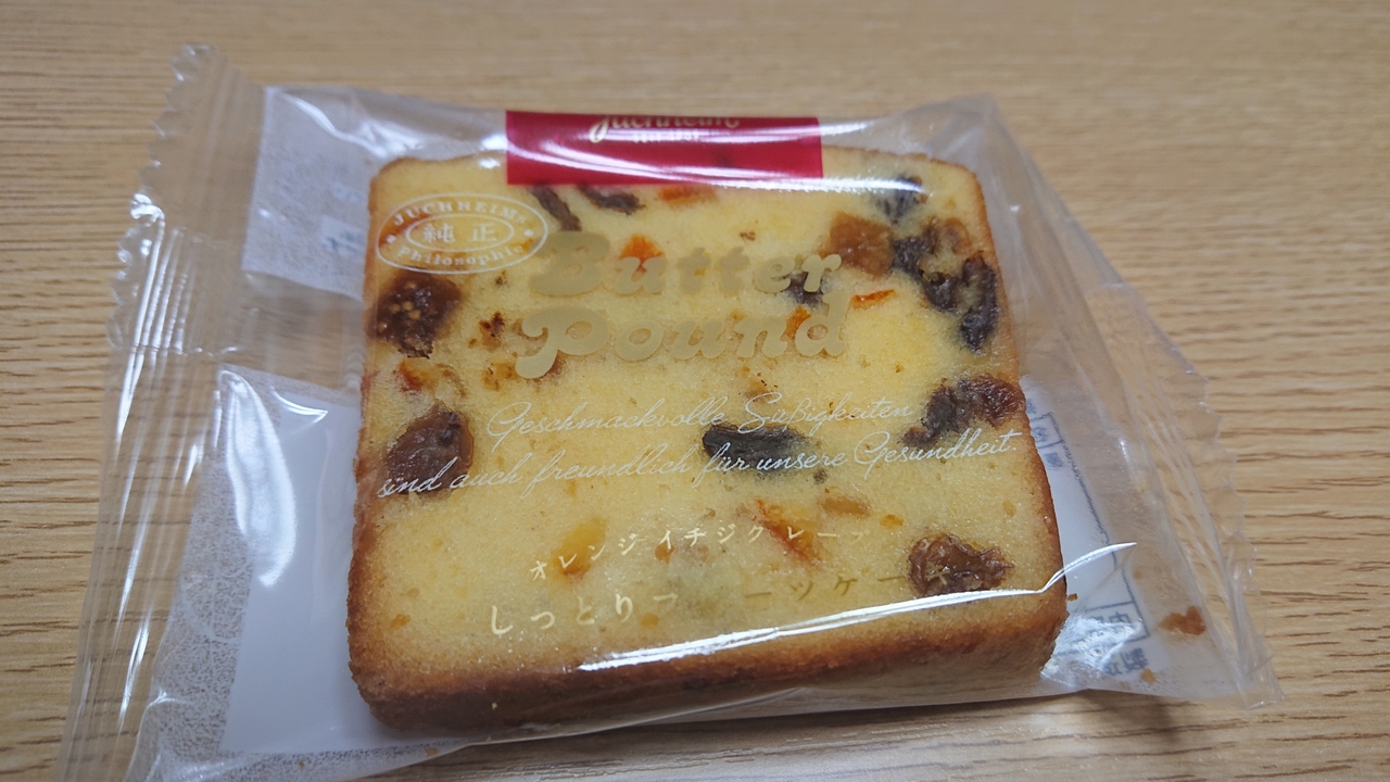 手軽に携帯できる系のお菓子を求めたく、訪問しました。そして、「しっとりフルーツケーキ」と、「キャラメルとりんごのしっとりケーキ」の、2種類のバターパウンドケーキを購入しました。前者はバターの風味がかなり感じられるケーキに、多種類のフルーツが入っていました。後者は、キャラメル風味のケーキに、りんごとレーズンが入っていました。ベースケーキの味は違いますが、どちらにも含まれるレーズンが、良いアクセントとなっており、おいしくいただけました。